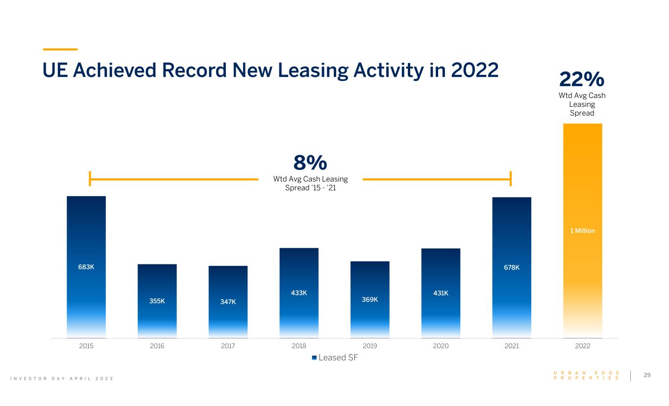 I N V E S T O R D A Y A P R I L 2 0 2 3 U R B A N E D G E P R O P E R T I E S 29 UE Achieved Record New Leasing Activity in 2022 683K 355K 347K 433K 369K 431K 678K 1 Million 2015 2016 2017 2018 2019 2020 2021 2022 Leased SF 22% Wtd Avg Cash Leasing Spread 8% Wtd Avg Cash Leasing Spread ’15 - ’21