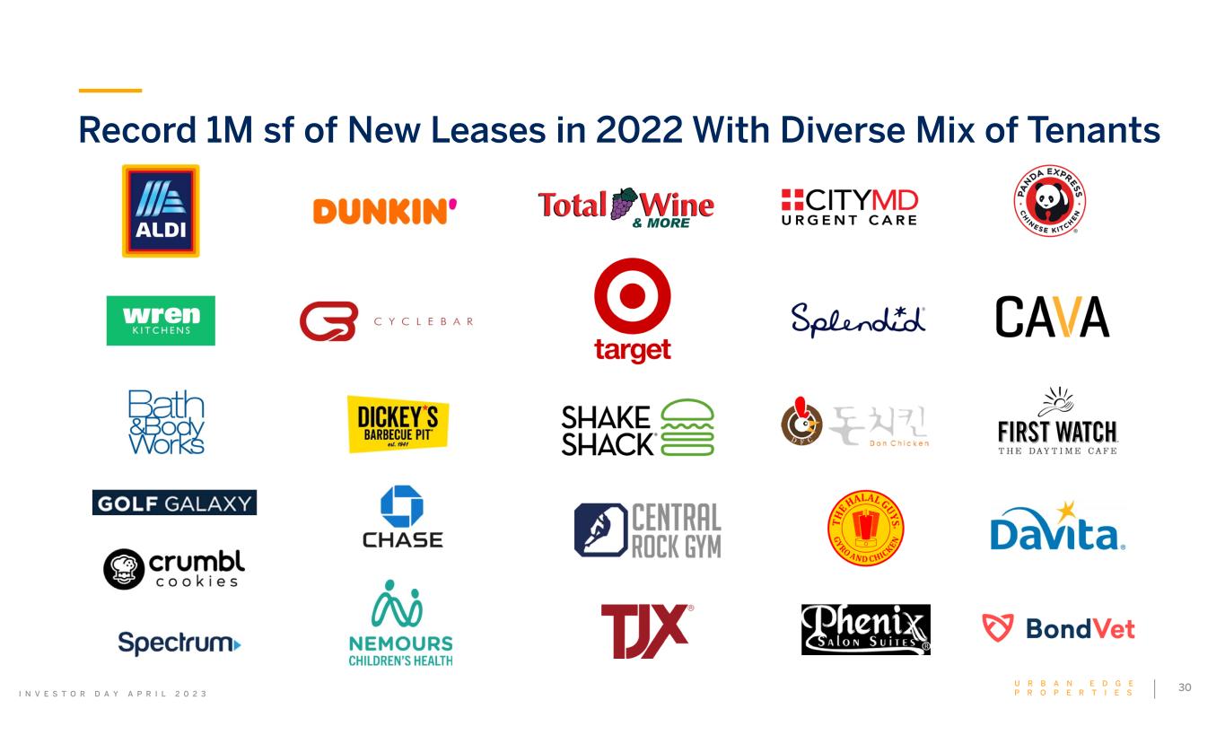 I N V E S T O R D A Y A P R I L 2 0 2 3 U R B A N E D G E P R O P E R T I E S 30 Record 1M sf of New Leases in 2022 With Diverse Mix of Tenants