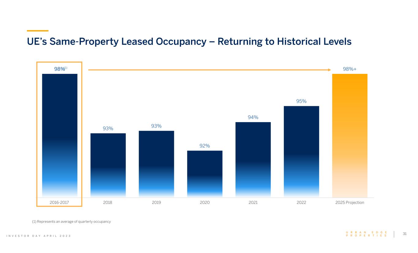 I N V E S T O R D A Y A P R I L 2 0 2 3 U R B A N E D G E P R O P E R T I E S 31 UE’s Same-Property Leased Occupancy – Returning to Historical Levels 98% 93% 93% 92% 94% 95% 98%+ 2016-2017 2018 2019 2020 2021 2022 2025 Projection (1) Represents an average of quarterly occupancy (1)