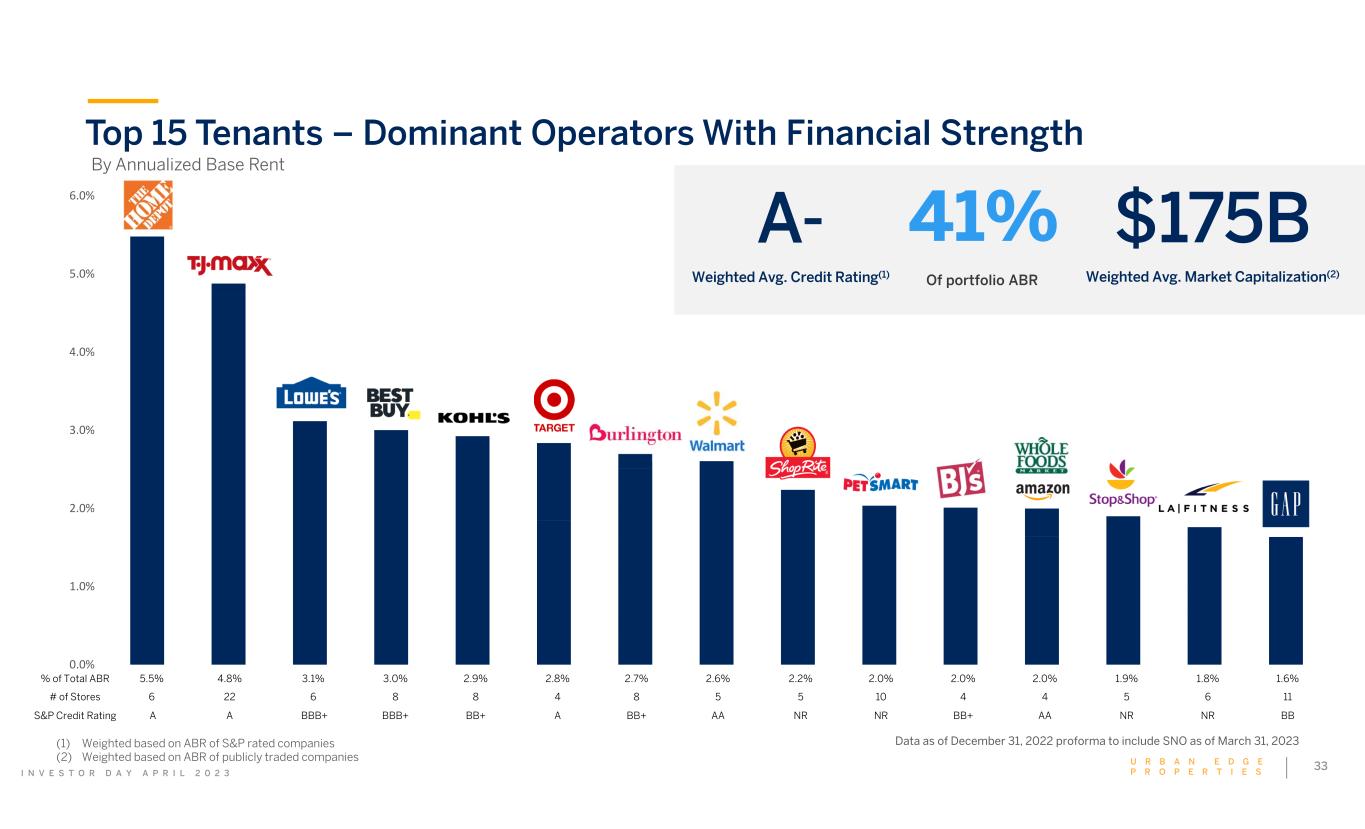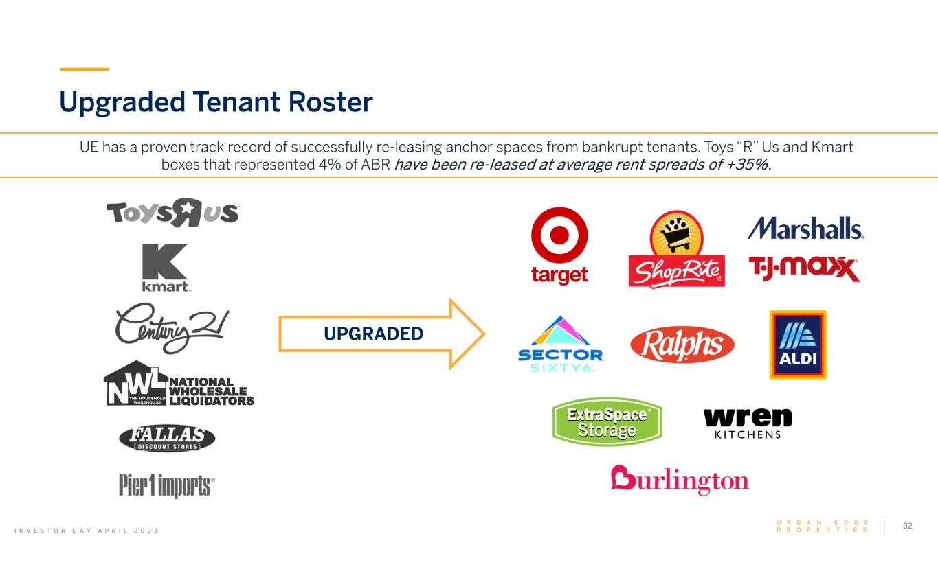 I N V E S T O R D A Y A P R I L 2 0 2 3 U R B A N E D G E P R O P E R T I E S 32 Upgraded Tenant Roster UPGRADED UE has a proven track record of successfully re-leasing anchor spaces from bankrupt tenants. Toys “R” Us and Kmart boxes that represented 4% of ABR have been re-leased at average rent spreads of +35%.