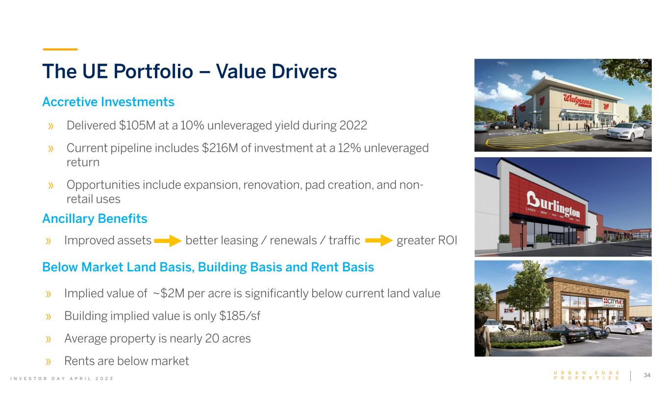 I N V E S T O R D A Y A P R I L 2 0 2 3 U R B A N E D G E P R O P E R T I E S 34 The UE Portfolio – Value Drivers Accretive Investments » Delivered $105M at a 10% unleveraged yield during 2022 » Current pipeline includes $216M of investment at a 12% unleveraged return » Opportunities include expansion, renovation, pad creation, and non- retail uses Ancillary Benefits » Improved assets better leasing / renewals / traffic greater ROI Below Market Land Basis, Building Basis and Rent Basis » Implied value of ~$2M per acre is significantly below current land value » Building implied value is only $185/sf » Average property is nearly 20 acres » Rents are below market