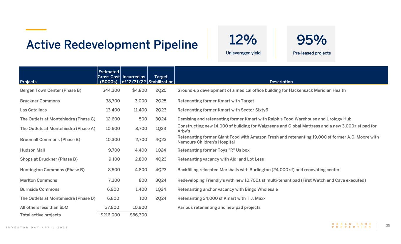 I N V E S T O R P R E S E N T A T I O N 35I N V E S T O R D A Y A P R I L 2 0 2 3 U R B A N E D G E P R O P E R T I E S Active Redevelopment Pipeline Description Target Stabilization Incurred as of 12/31/22 Estimated Gross Cost ($000s)Projects Ground-up development of a medical office building for Hackensack Meridian Health2Q25$4,800$44,300Bergen Town Center (Phase B) Retenanting former Kmart with Target2Q253,00038,700Bruckner Commons Retenanting former Kmart with Sector Sixty62Q2311,40013,400Las Catalinas Demising and retenanting former Kmart with Ralph's Food Warehouse and Urology Hub3Q2450012,600The Outlets at Montehiedra (Phase C) Constructing new 14,000 sf building for Walgreens and Global Mattress and a new 3,000± sf pad for Arby's 1Q238,70010,600The Outlets at Montehiedra (Phase A) Retenanting former Giant Food with Amazon Fresh and retenanting 19,000 sf former A.C. Moore with Nemours Children's Hospital 4Q232,70010,300Broomall Commons (Phase B) Retenanting former Toys "R" Us box1Q244,4009,700Hudson Mall Retenanting vacancy with Aldi and Lot Less4Q232,8009,100Shops at Bruckner (Phase B) Backfilling relocated Marshalls with Burlington (24,000 sf) and renovating center4Q234,8008,500Huntington Commons (Phase B) Redeveloping Friendly's with new 10,700± sf multi-tenant pad (First Watch and Cava executed)3Q248007,300Marlton Commons Retenanting anchor vacancy with Bingo Wholesale1Q241,4006,900Burnside Commons Retenanting 24,000 sf Kmart with T.J. Maxx2Q241006,800The Outlets at Montehiedra (Phase D) Various retenanting and new pad projects10,90037,800All others less than $5M $56,300$216,000Total active projects 12% Unleveraged yield 95% Pre-leased projects