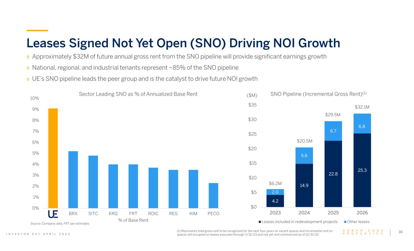 I N V E S T O R D A Y A P R I L 2 0 2 3 U R B A N E D G E P R O P E R T I E S 36 Leases Signed Not Yet Open (SNO) Driving NOI Growth » Approximately $32M of future annual gross rent from the SNO pipeline will provide significant earnings growth » National, regional, and industrial tenants represent ~85% of the SNO pipeline » UE’s SNO pipeline leads the peer group and is the catalyst to drive future NOI growth 4.2 14.9 22.8 25.3 2.0 5.6 6.7 6.8 $0 $5 $10 $15 $20 $25 $30 $35 2023 2024 2025 2026 SNO Pipeline (Incremental Gross Rent)(1) Leases included in redevelopment projects Other leases $32.1M $29.5M $20.5M $6.2M (1) Represents total gross rent to be recognized for the next four years on vacant spaces and incremental rent on spaces still occupied on leases executed through 3/31/23 and not yet rent commenced as of 12/31/22 0% 1% 2% 3% 4% 5% 6% 7% 8% 9% 10% UE BRX SITC KRG FRT ROIC REG KIM PECO % of Base Rent Sector Leading SNO as % of Annualized Base Rent Source: Company data. FRT per estimates ($M)