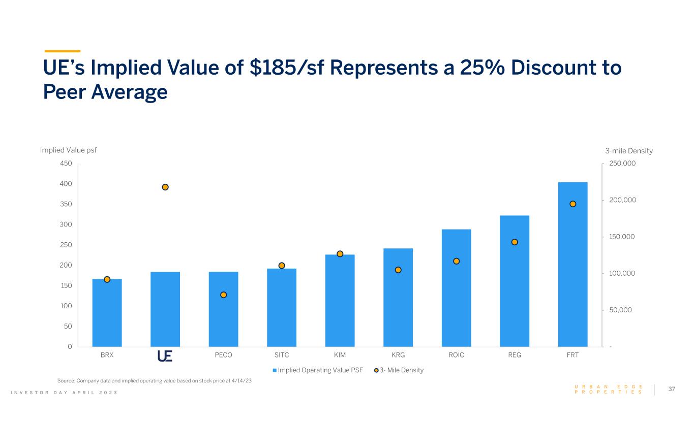 I N V E S T O R D A Y A P R I L 2 0 2 3 U R B A N E D G E P R O P E R T I E S 37 UE’s Implied Value of $185/sf Represents a 25% Discount to Peer Average Source: Company data and implied operating value based on stock price at 4/14/23 - 50,000 100,000 150,000 200,000 250,000 0 50 100 150 200 250 300 350 400 450 BRX UE PECO SITC KIM KRG ROIC REG FRT 3-mile DensityImplied Value psf Implied Operating Value PSF 3- Mile Density