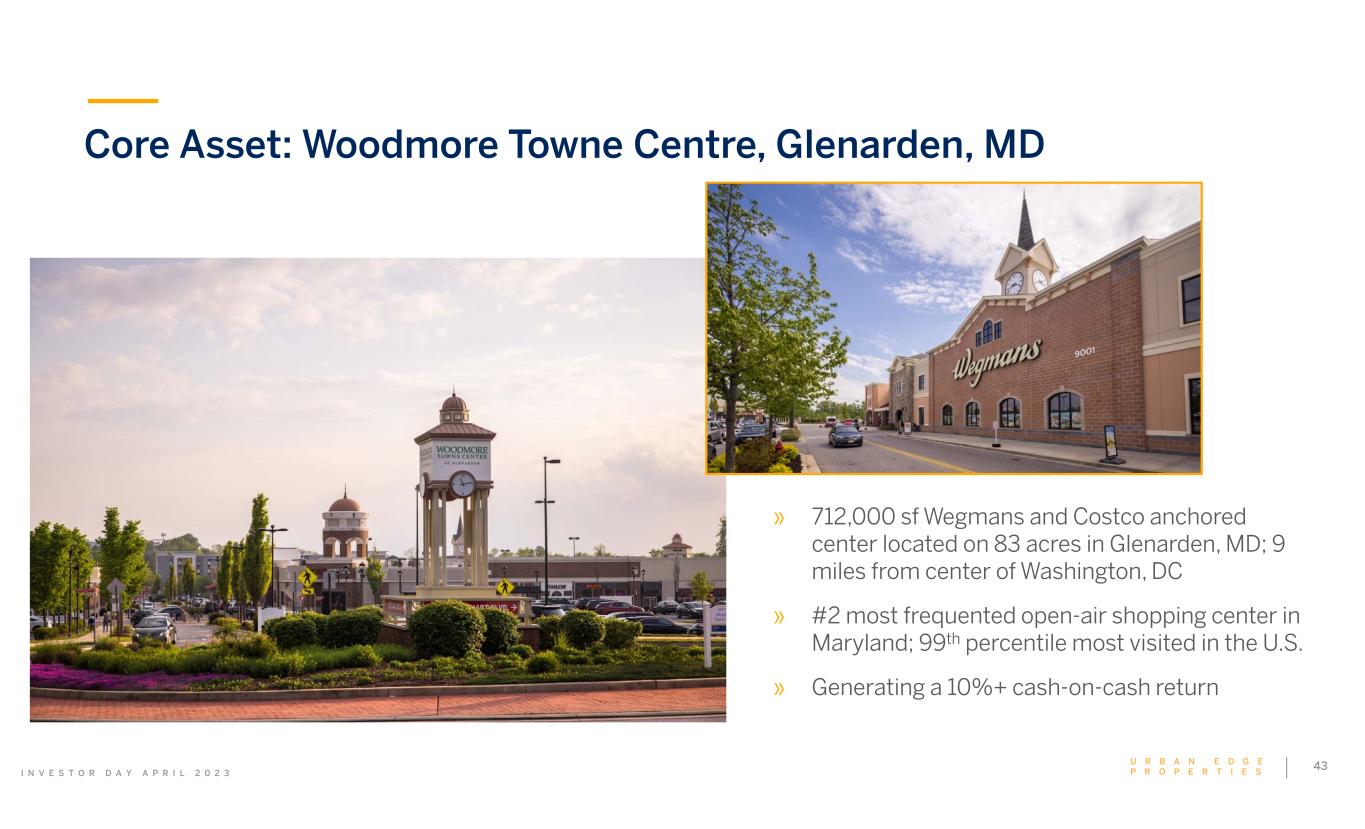 I N V E S T O R D A Y A P R I L 2 0 2 3 U R B A N E D G E P R O P E R T I E S 43 Core Asset: Woodmore Towne Centre, Glenarden, MD » 712,000 sf Wegmans and Costco anchored center located on 83 acres in Glenarden, MD; 9 miles from center of Washington, DC » #2 most frequented open-air shopping center in Maryland; 99th percentile most visited in the U.S. » Generating a 10%+ cash-on-cash return