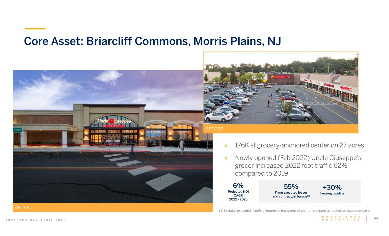 I N V E S T O R D A Y A P R I L 2 0 2 3 U R B A N E D G E P R O P E R T I E S 44 Core Asset: Briarcliff Commons, Morris Plains, NJ AFTER BEFORE » 176K sf grocery-anchored center on 27 acres » Newly opened (Feb 2022) Uncle Giuseppe’s grocer increased 2022 foot traffic 62% compared to 2019 55% From executed leases and contractual bumps(1) +30% Leasing pipeline 6% Projected NOI CAGR 2022 - 2025 (1) Includes expected benefit of improved recoveries of operating expenses related to occupancy gains