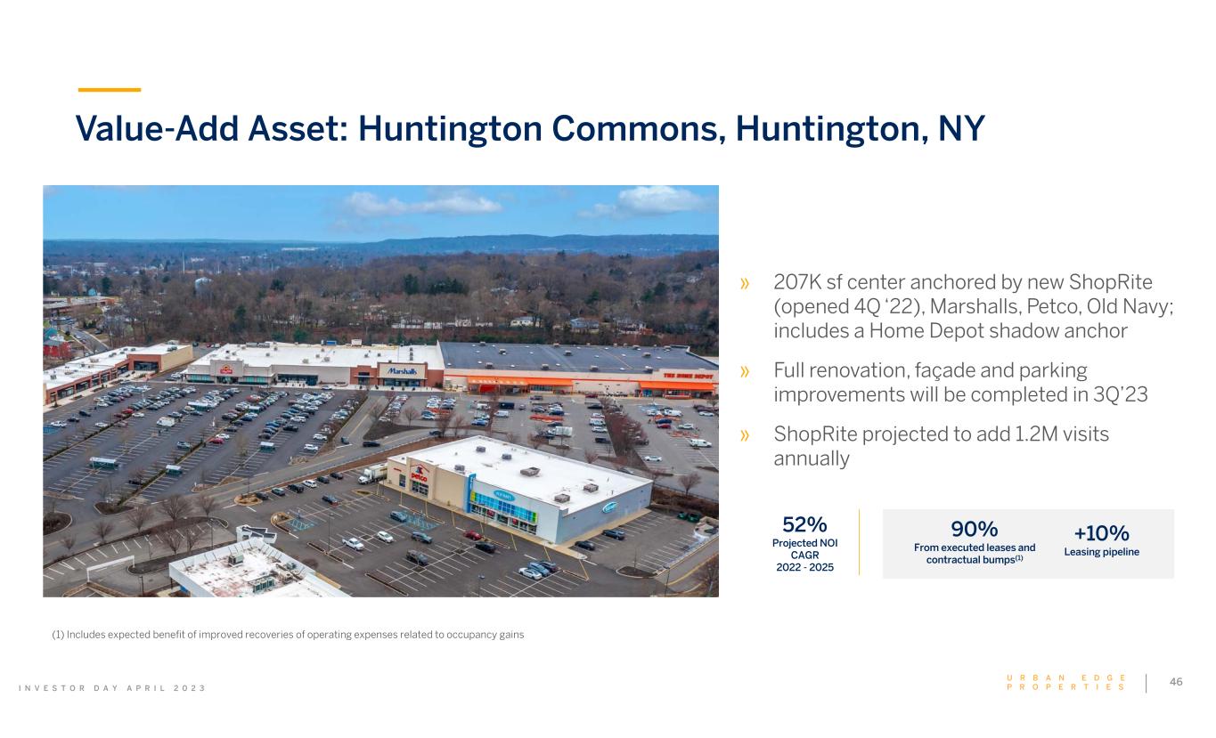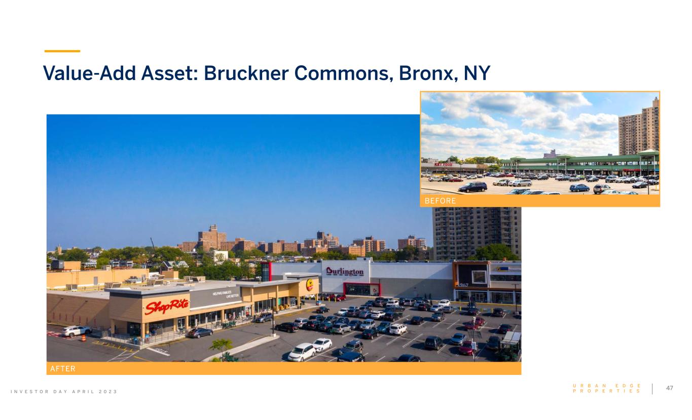 I N V E S T O R D A Y A P R I L 2 0 2 3 U R B A N E D G E P R O P E R T I E S 46 Value-Add Asset: Huntington Commons, Huntington, NY » 207K sf center anchored by new ShopRite (opened 4Q ‘22), Marshalls, Petco, Old Navy; includes a Home Depot shadow anchor » Full renovation, façade and parking improvements will be completed in 3Q’23 » ShopRite projected to add 1.2M visits annually 90% From executed leases and contractual bumps(1) +10% Leasing pipeline 52% Projected NOI CAGR 2022 - 2025 (1) Includes expected benefit of improved recoveries of operating expenses related to occupancy gains