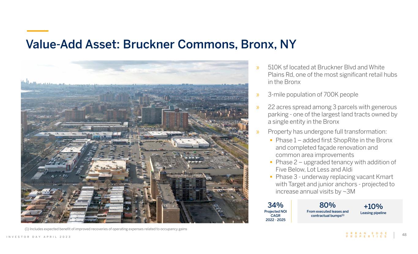 I N V E S T O R D A Y A P R I L 2 0 2 3 U R B A N E D G E P R O P E R T I E S 48 Value-Add Asset: Bruckner Commons, Bronx, NY » 510K sf located at Bruckner Blvd and White Plains Rd, one of the most significant retail hubs in the Bronx » 3-mile population of 700K people » 22 acres spread among 3 parcels with generous parking - one of the largest land tracts owned by a single entity in the Bronx » Property has undergone full transformation:  Phase 1 – added first ShopRite in the Bronx and completed façade renovation and common area improvements  Phase 2 – upgraded tenancy with addition of Five Below, Lot Less and Aldi  Phase 3 - underway replacing vacant Kmart with Target and junior anchors - projected to increase annual visits by ~3M 80% From executed leases and contractual bumps(1) +10% Leasing pipeline 34% Projected NOI CAGR 2022 - 2025 (1) Includes expected benefit of improved recoveries of operating expenses related to occupancy gains