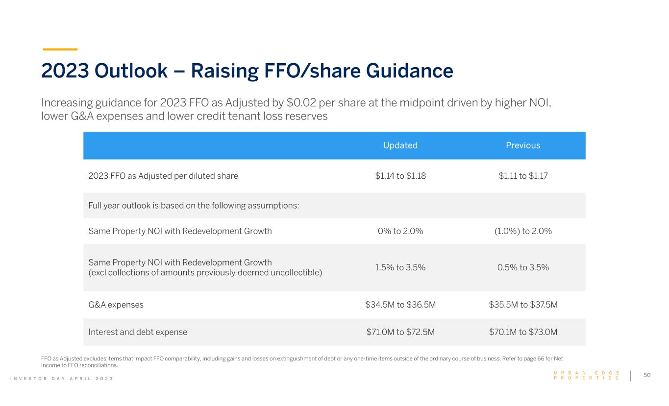 I N V E S T O R D A Y A P R I L 2 0 2 3 U R B A N E D G E P R O P E R T I E S 50 2023 Outlook – Raising FFO/share Guidance PreviousUpdated $1.11 to $1.17$1.14 to $1.182023 FFO as Adjusted per diluted share Full year outlook is based on the following assumptions: (1.0%) to 2.0%0% to 2.0%Same Property NOI with Redevelopment Growth 0.5% to 3.5%1.5% to 3.5% Same Property NOI with Redevelopment Growth (excl collections of amounts previously deemed uncollectible) $35.5M to $37.5M$34.5M to $36.5MG&A expenses $70.1M to $73.0M$71.0M to $72.5MInterest and debt expense FFO as Adjusted excludes items that impact FFO comparability, including gains and losses on extinguishment of debt or any one-time items outside of the ordinary course of business. Refer to page 66 for Net Income to FFO reconciliations. Increasing guidance for 2023 FFO as Adjusted by $0.02 per share at the midpoint driven by higher NOI, lower G&A expenses and lower credit tenant loss reserves
