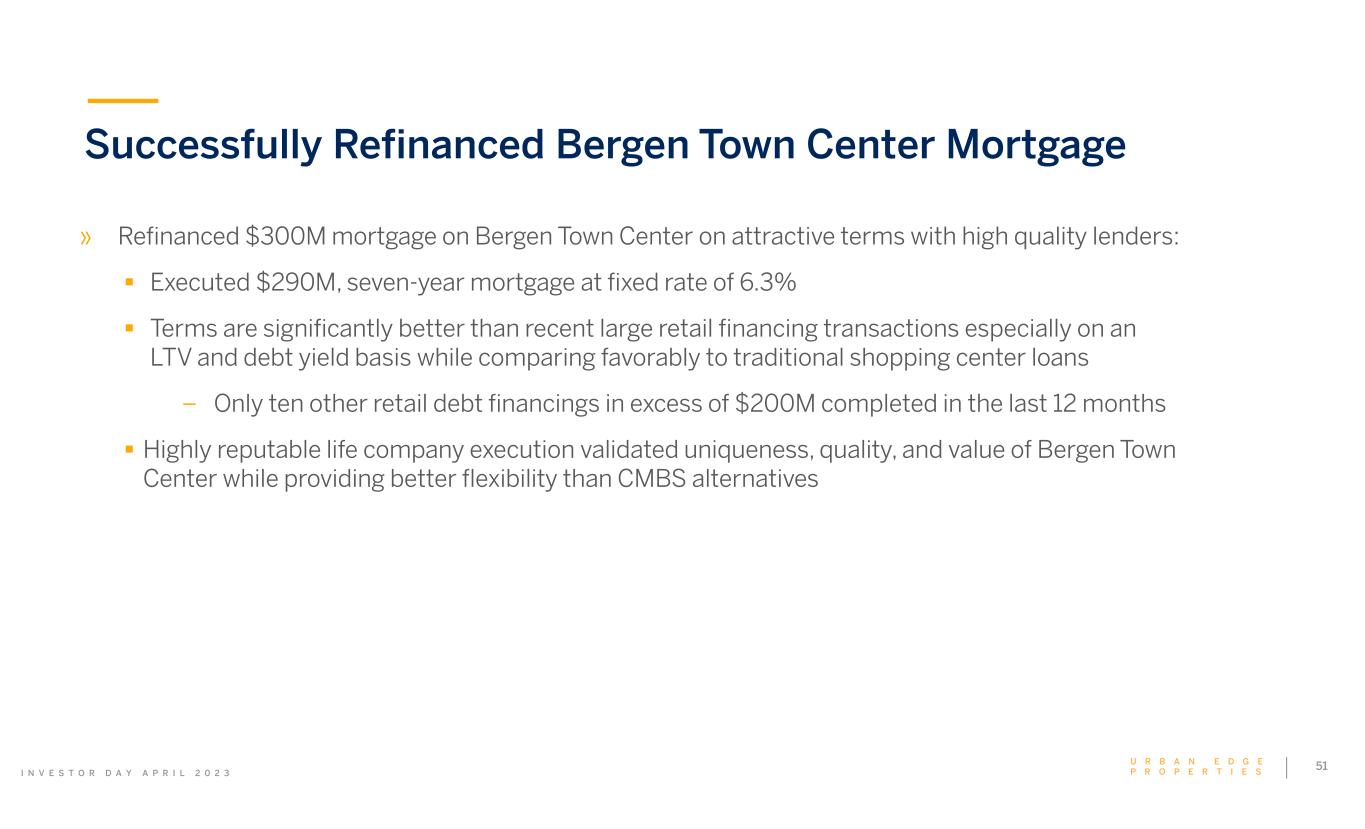 I N V E S T O R D A Y A P R I L 2 0 2 3 U R B A N E D G E P R O P E R T I E S 51 Successfully Refinanced Bergen Town Center Mortgage » Refinanced $300M mortgage on Bergen Town Center on attractive terms with high quality lenders:  Executed $290M, seven-year mortgage at fixed rate of 6.3%  Terms are significantly better than recent large retail financing transactions especially on an LTV and debt yield basis while comparing favorably to traditional shopping center loans – Only ten other retail debt financings in excess of $200M completed in the last 12 months  Highly reputable life company execution validated uniqueness, quality, and value of Bergen Town Center while providing better flexibility than CMBS alternatives
