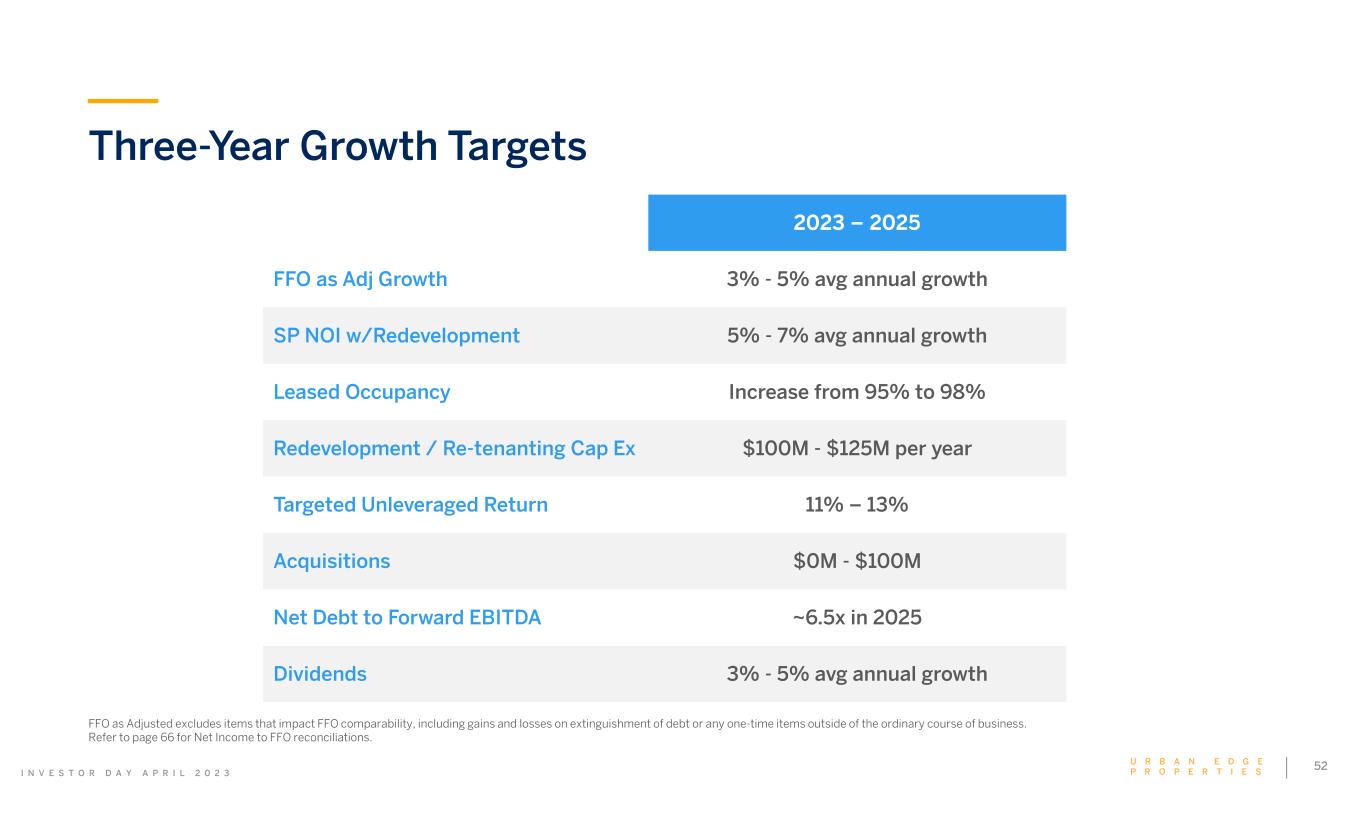 I N V E S T O R D A Y A P R I L 2 0 2 3 U R B A N E D G E P R O P E R T I E S 52 Three-Year Growth Targets 2023 – 2025 3% - 5% avg annual growthFFO as Adj Growth 5% - 7% avg annual growthSP NOI w/Redevelopment Increase from 95% to 98%Leased Occupancy $100M - $125M per yearRedevelopment / Re-tenanting Cap Ex 11% – 13%Targeted Unleveraged Return $0M - $100MAcquisitions ~6.5x in 2025Net Debt to Forward EBITDA 3% - 5% avg annual growthDividends FFO as Adjusted excludes items that impact FFO comparability, including gains and losses on extinguishment of debt or any one-time items outside of the ordinary course of business. Refer to page 66 for Net Income to FFO reconciliations.