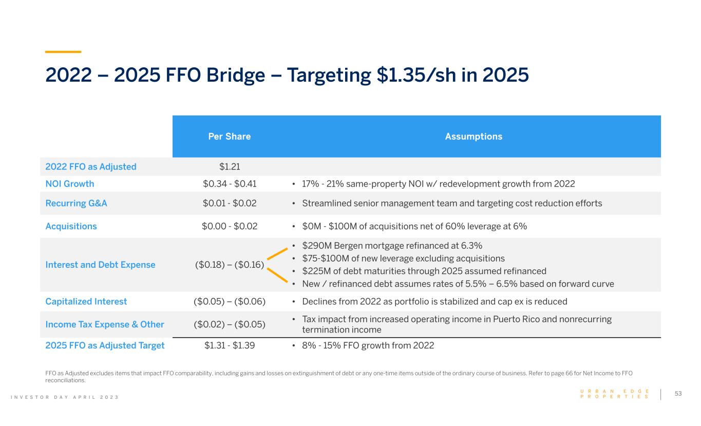 I N V E S T O R D A Y A P R I L 2 0 2 3 U R B A N E D G E P R O P E R T I E S 53 2022 – 2025 FFO Bridge – Targeting $1.35/sh in 2025 AssumptionsPer Share $1.212022 FFO as Adjusted • 17% - 21% same-property NOI w/ redevelopment growth from 2022$0.34 - $0.41NOI Growth • Streamlined senior management team and targeting cost reduction efforts$0.01 - $0.02Recurring G&A • $0M - $100M of acquisitions net of 60% leverage at 6%$0.00 - $0.02Acquisitions • $290M Bergen mortgage refinanced at 6.3% • $75-$100M of new leverage excluding acquisitions • $225M of debt maturities through 2025 assumed refinanced • New / refinanced debt assumes rates of 5.5% – 6.5% based on forward curve ($0.18) – ($0.16)Interest and Debt Expense • Declines from 2022 as portfolio is stabilized and cap ex is reduced($0.05) – ($0.06)Capitalized Interest • Tax impact from increased operating income in Puerto Rico and nonrecurring termination income ($0.02) – ($0.05)Income Tax Expense & Other • 8% - 15% FFO growth from 2022$1.31 - $1.392025 FFO as Adjusted Target FFO as Adjusted excludes items that impact FFO comparability, including gains and losses on extinguishment of debt or any one-time items outside of the ordinary course of business. Refer to page 66 for Net Income to FFO reconciliations.