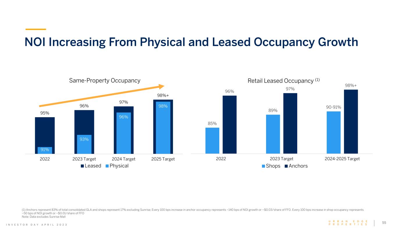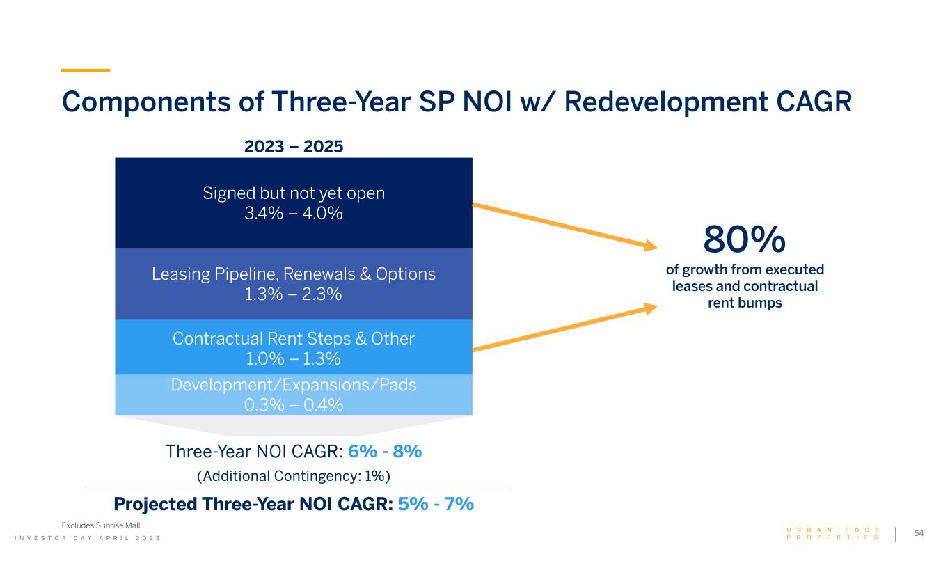 I N V E S T O R D A Y A P R I L 2 0 2 3 U R B A N E D G E P R O P E R T I E S 54 Components of Three-Year SP NOI w/ Redevelopment CAGR Excludes Sunrise Mall Signed but not yet open 3.4% – 4.0% Leasing Pipeline, Renewals & Options 1.3% – 2.3% Contractual Rent Steps & Other 1.0% – 1.3% Development/Expansions/Pads 0.3% – 0.4% Three-Year NOI CAGR: 6% - 8% 2023 – 2025 (Additional Contingency: 1%) Projected Three-Year NOI CAGR: 5% - 7% 80% of growth from executed leases and contractual rent bumps