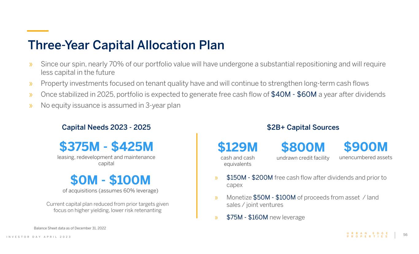 I N V E S T O R D A Y A P R I L 2 0 2 3 U R B A N E D G E P R O P E R T I E S 56 Three-Year Capital Allocation Plan Capital Needs 2023 - 2025 $2B+ Capital Sources » $150M - $200M free cash flow after dividends and prior to capex » Monetize $50M - $100M of proceeds from asset / land sales / joint ventures » $75M - $160M new leverage » Since our spin, nearly 70% of our portfolio value will have undergone a substantial repositioning and will require less capital in the future » Property investments focused on tenant quality have and will continue to strengthen long-term cash flows » Once stabilized in 2025, portfolio is expected to generate free cash flow of $40M - $60M a year after dividends » No equity issuance is assumed in 3-year plan $375M - $425M leasing, redevelopment and maintenance capital $0M - $100M of acquisitions (assumes 60% leverage) $129M cash and cash equivalents $900M unencumbered assets $800M undrawn credit facility Balance Sheet data as of December 31, 2022 Current capital plan reduced from prior targets given focus on higher yielding, lower risk retenanting
