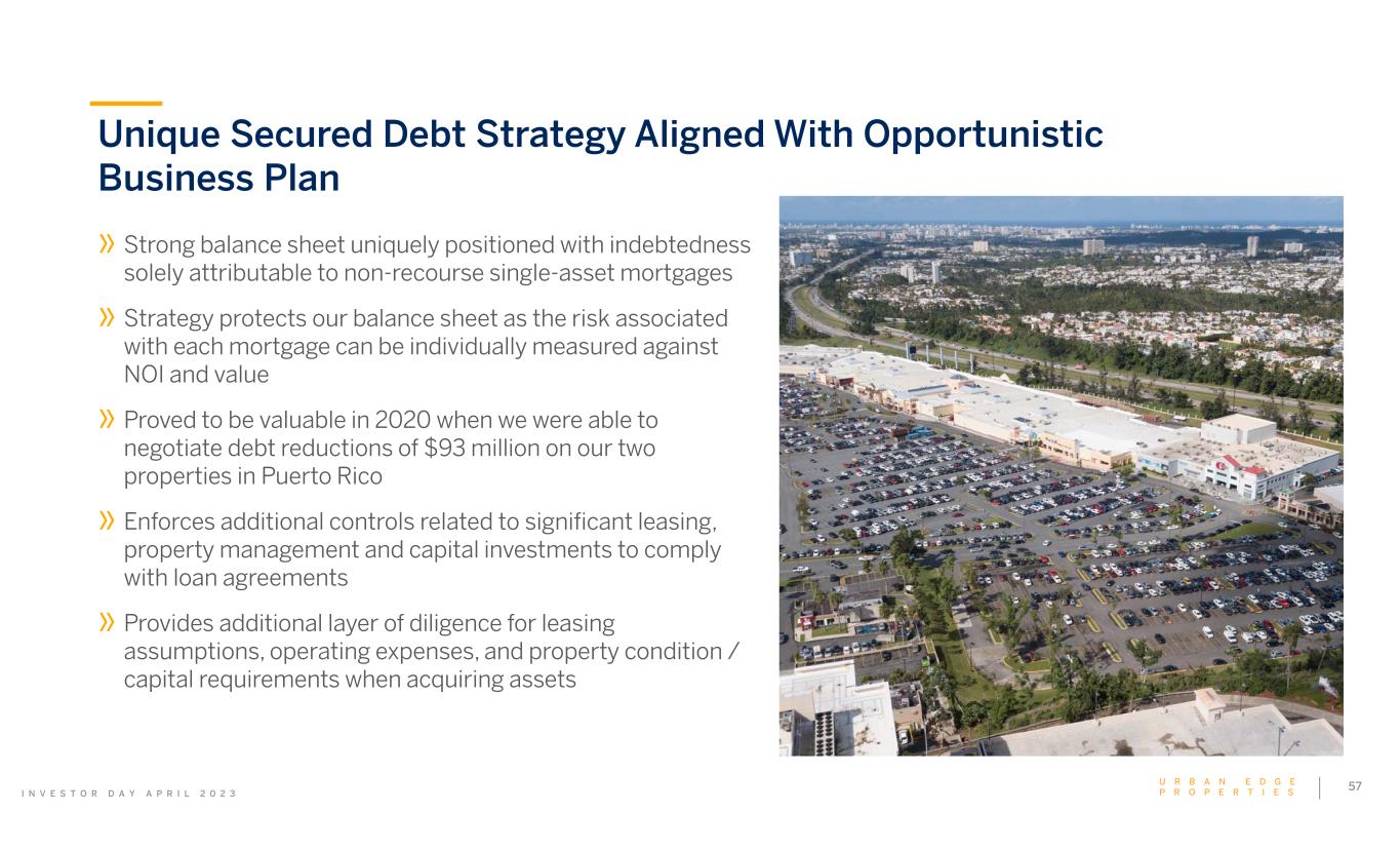 I N V E S T O R D A Y A P R I L 2 0 2 3 U R B A N E D G E P R O P E R T I E S 57 Unique Secured Debt Strategy Aligned With Opportunistic Business Plan » Strong balance sheet uniquely positioned with indebtedness solely attributable to non-recourse single-asset mortgages » Strategy protects our balance sheet as the risk associated with each mortgage can be individually measured against NOI and value » Proved to be valuable in 2020 when we were able to negotiate debt reductions of $93 million on our two properties in Puerto Rico » Enforces additional controls related to significant leasing, property management and capital investments to comply with loan agreements » Provides additional layer of diligence for leasing assumptions, operating expenses, and property condition / capital requirements when acquiring assets