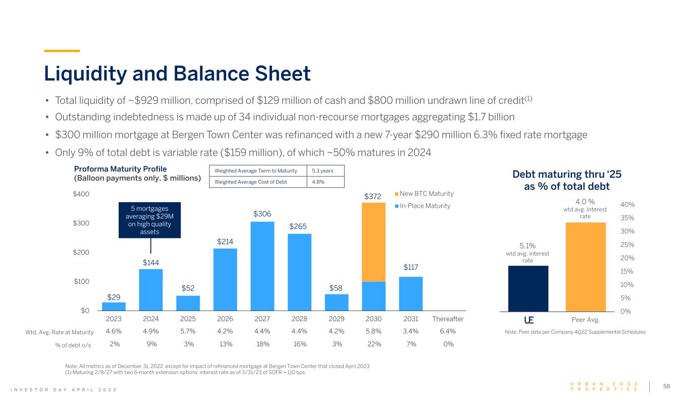I N V E S T O R D A Y A P R I L 2 0 2 3 U R B A N E D G E P R O P E R T I E S 58 Liquidity and Balance Sheet • Total liquidity of ~$929 million, comprised of $129 million of cash and $800 million undrawn line of credit(1) • Outstanding indebtedness is made up of 34 individual non-recourse mortgages aggregating $1.7 billion • $300 million mortgage at Bergen Town Center was refinanced with a new 7-year $290 million 6.3% fixed rate mortgage • Only 9% of total debt is variable rate ($159 million), of which ~50% matures in 2024 Proforma Maturity Profile (Balloon payments only, $ millions) $29 $144 $52 $214 $306 $265 $58 $117 $0 $100 $200 $300 $400 2023 2024 2025 2026 2027 2028 2029 2030 2031 Thereafter 4.6% 4.9% 5.7% 4.2% 4.4% 4.4% 4.2% 5.8% 3.4% 6.4% Refinanced Maturity In-Place Maturity Note: All metrics as of December 31, 2022, except for impact of refinanced mortgage at Bergen Town Center that closed April 2023 (1) Maturing 2/9/27 with two 6-month extension options; interest rate as of 3/31/23 of SOFR + 110 bps 5.3 yearsWeighted Average Term to Maturity 4.8%Weighted Average Cost of Debt Wtd. Avg. Rate at Maturity % of debt o/s 0%7%22%3%16%18%13%3%9%2% $372 0% 5% 10% 15% 20% 25% 30% 35% 40% UE Peer Avg. Debt maturing thru ‘25 as % of total debt 5.1% wtd avg. interest rate Note: Peer data per Company 4Q22 Supplemental Schedules 5 mortgages averaging $29M on high quality assets N w BTC Maturity 4.0 % wtd avg. interest rate
