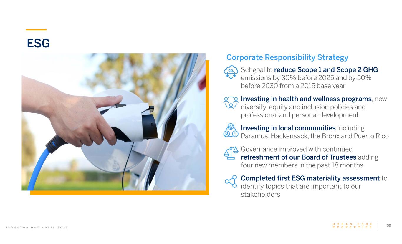 I N V E S T O R D A Y A P R I L 2 0 2 3 U R B A N E D G E P R O P E R T I E S 59 ESG Set goal to reduce Scope 1 and Scope 2 GHG emissions by 30% before 2025 and by 50% before 2030 from a 2015 base year Investing in health and wellness programs, new diversity, equity and inclusion policies and professional and personal development Investing in local communities including Paramus, Hackensack, the Bronx and Puerto Rico Governance improved with continued refreshment of our Board of Trustees adding four new members in the past 18 months Completed first ESG materiality assessment to identify topics that are important to our stakeholders Corporate Responsibility Strategy