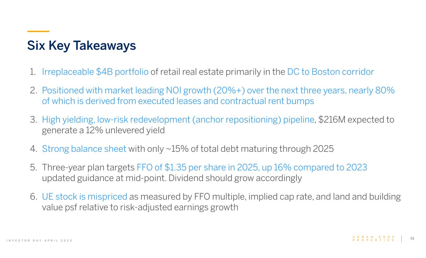 I N V E S T O R D A Y A P R I L 2 0 2 3 U R B A N E D G E P R O P E R T I E S 61 Six Key Takeaways 1. Irreplaceable $4B portfolio of retail real estate primarily in the DC to Boston corridor 2. Positioned with market leading NOI growth (20%+) over the next three years, nearly 80% of which is derived from executed leases and contractual rent bumps 3. High yielding, low-risk redevelopment (anchor repositioning) pipeline, $216M expected to generate a 12% unlevered yield 4. Strong balance sheet with only ~15% of total debt maturing through 2025 5. Three-year plan targets FFO of $1.35 per share in 2025, up 16% compared to 2023 updated guidance at mid-point. Dividend should grow accordingly 6. UE stock is mispriced as measured by FFO multiple, implied cap rate, and land and building value psf relative to risk-adjusted earnings growth