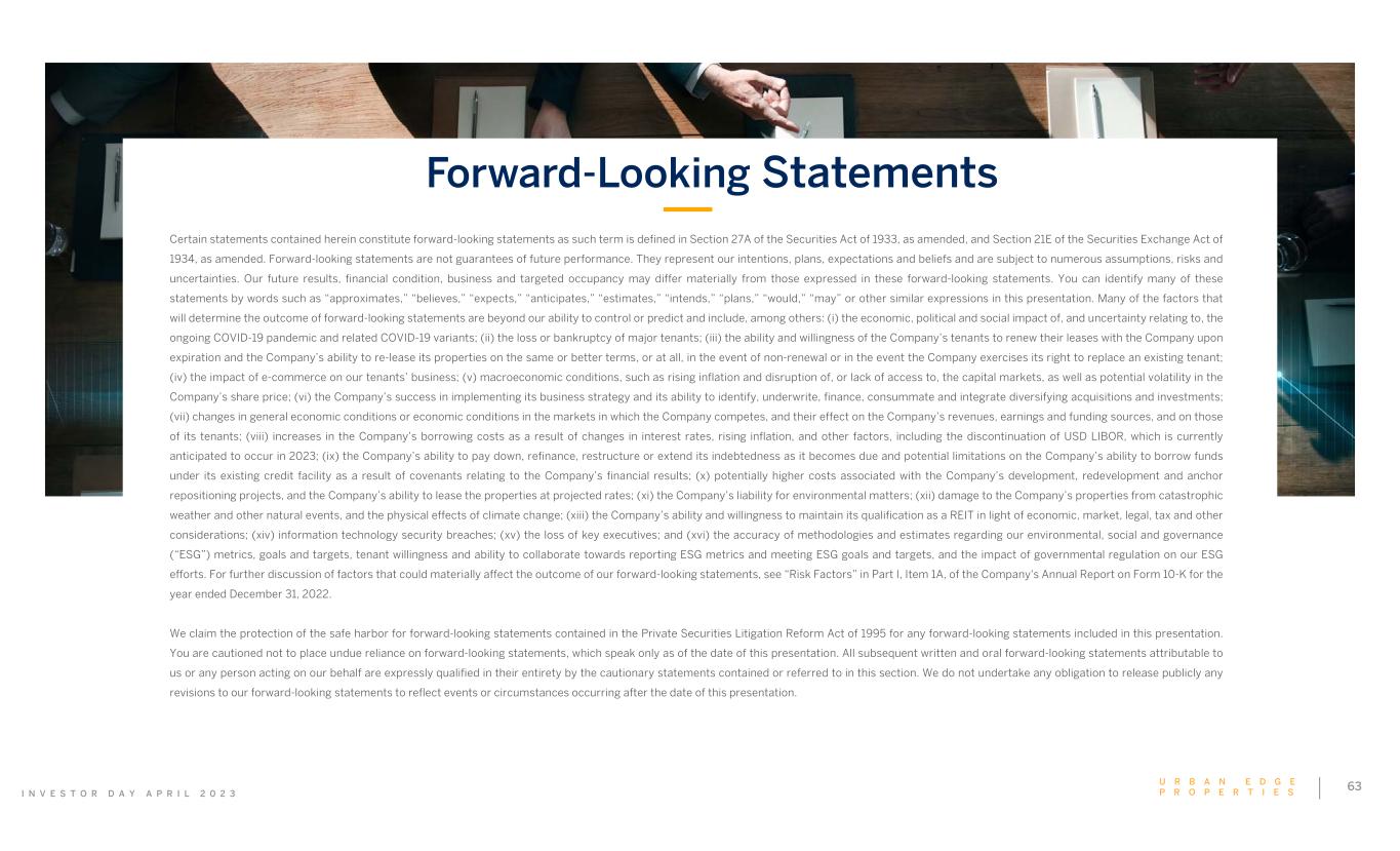 I N V E S T O R D A Y A P R I L 2 0 2 3 U R B A N E D G E P R O P E R T I E S 63 Certain statements contained herein constitute forward-looking statements as such term is defined in Section 27A of the Securities Act of 1933, as amended, and Section 21E of the Securities Exchange Act of 1934, as amended. Forward-looking statements are not guarantees of future performance. They represent our intentions, plans, expectations and beliefs and are subject to numerous assumptions, risks and uncertainties. Our future results, financial condition, business and targeted occupancy may differ materially from those expressed in these forward-looking statements. You can identify many of these statements by words such as “approximates,” “believes,” “expects,” “anticipates,” “estimates,” “intends,” “plans,” “would,” “may” or other similar expressions in this presentation. Many of the factors that will determine the outcome of forward-looking statements are beyond our ability to control or predict and include, among others: (i) the economic, political and social impact of, and uncertainty relating to, the ongoing COVID-19 pandemic and related COVID-19 variants; (ii) the loss or bankruptcy of major tenants; (iii) the ability and willingness of the Company’s tenants to renew their leases with the Company upon expiration and the Company’s ability to re-lease its properties on the same or better terms, or at all, in the event of non-renewal or in the event the Company exercises its right to replace an existing tenant; (iv) the impact of e-commerce on our tenants’ business; (v) macroeconomic conditions, such as rising inflation and disruption of, or lack of access to, the capital markets, as well as potential volatility in the Company’s share price; (vi) the Company’s success in implementing its business strategy and its ability to identify, underwrite, finance, consummate and integrate diversifying acquisitions and investments; (vii) changes in general economic conditions or economic conditions in the markets in which the Company competes, and their effect on the Company’s revenues, earnings and funding sources, and on those of its tenants; (viii) increases in the Company’s borrowing costs as a result of changes in interest rates, rising inflation, and other factors, including the discontinuation of USD LIBOR, which is currently anticipated to occur in 2023; (ix) the Company’s ability to pay down, refinance, restructure or extend its indebtedness as it becomes due and potential limitations on the Company’s ability to borrow funds under its existing credit facility as a result of covenants relating to the Company’s financial results; (x) potentially higher costs associated with the Company’s development, redevelopment and anchor repositioning projects, and the Company’s ability to lease the properties at projected rates; (xi) the Company’s liability for environmental matters; (xii) damage to the Company’s properties from catastrophic weather and other natural events, and the physical effects of climate change; (xiii) the Company’s ability and willingness to maintain its qualification as a REIT in light of economic, market, legal, tax and other considerations; (xiv) information technology security breaches; (xv) the loss of key executives; and (xvi) the accuracy of methodologies and estimates regarding our environmental, social and governance (“ESG”) metrics, goals and targets, tenant willingness and ability to collaborate towards reporting ESG metrics and meeting ESG goals and targets, and the impact of governmental regulation on our ESG efforts. For further discussion of factors that could materially affect the outcome of our forward-looking statements, see “Risk Factors” in Part I, Item 1A, of the Company's Annual Report on Form 10-K for the year ended December 31, 2022. We claim the protection of the safe harbor for forward-looking statements contained in the Private Securities Litigation Reform Act of 1995 for any forward-looking statements included in this presentation. You are cautioned not to place undue reliance on forward-looking statements, which speak only as of the date of this presentation. All subsequent written and oral forward-looking statements attributable to us or any person acting on our behalf are expressly qualified in their entirety by the cautionary statements contained or referred to in this section. We do not undertake any obligation to release publicly any revisions to our forward-looking statements to reflect events or circumstances occurring after the date of this presentation. Forward-Looking Statements