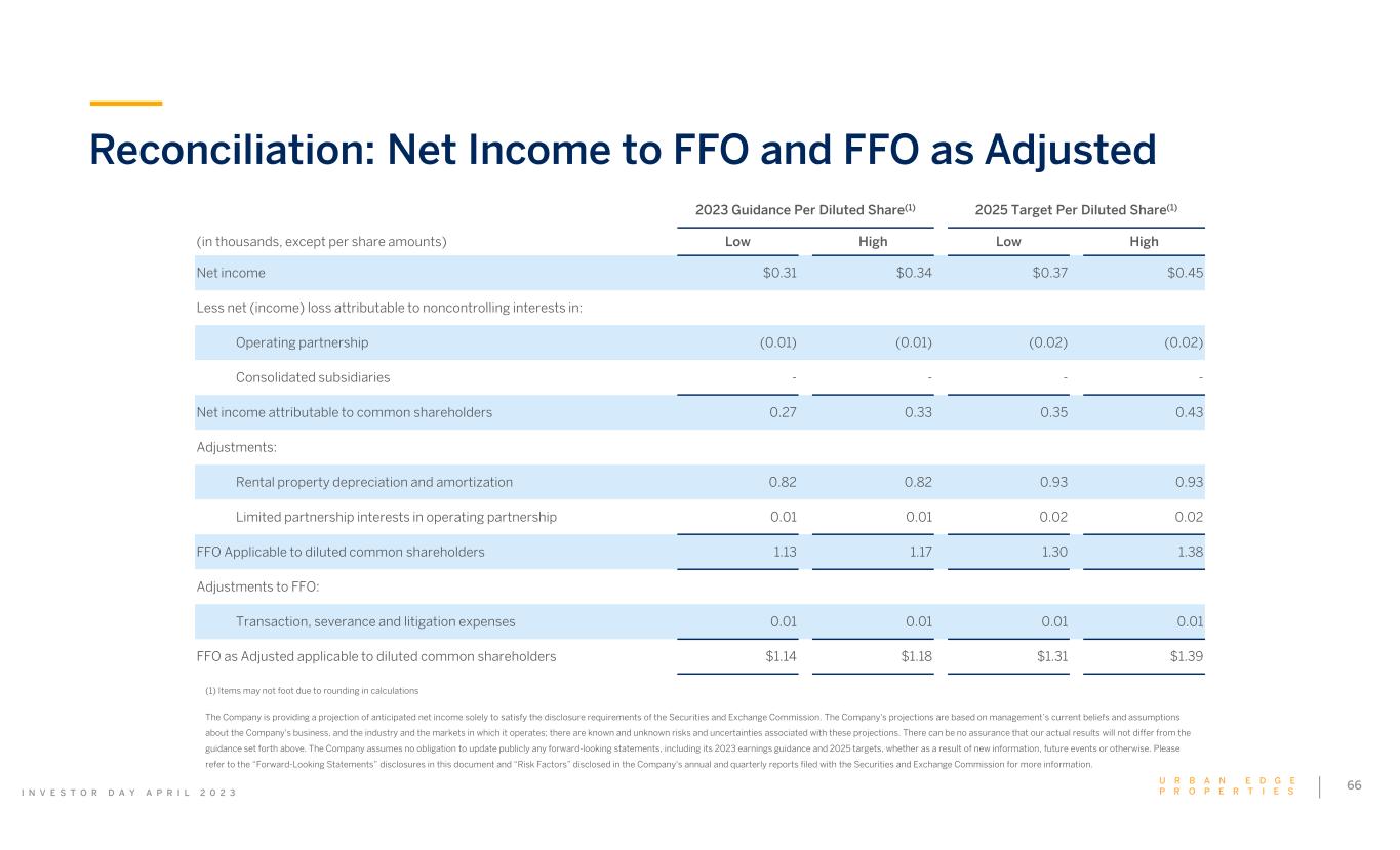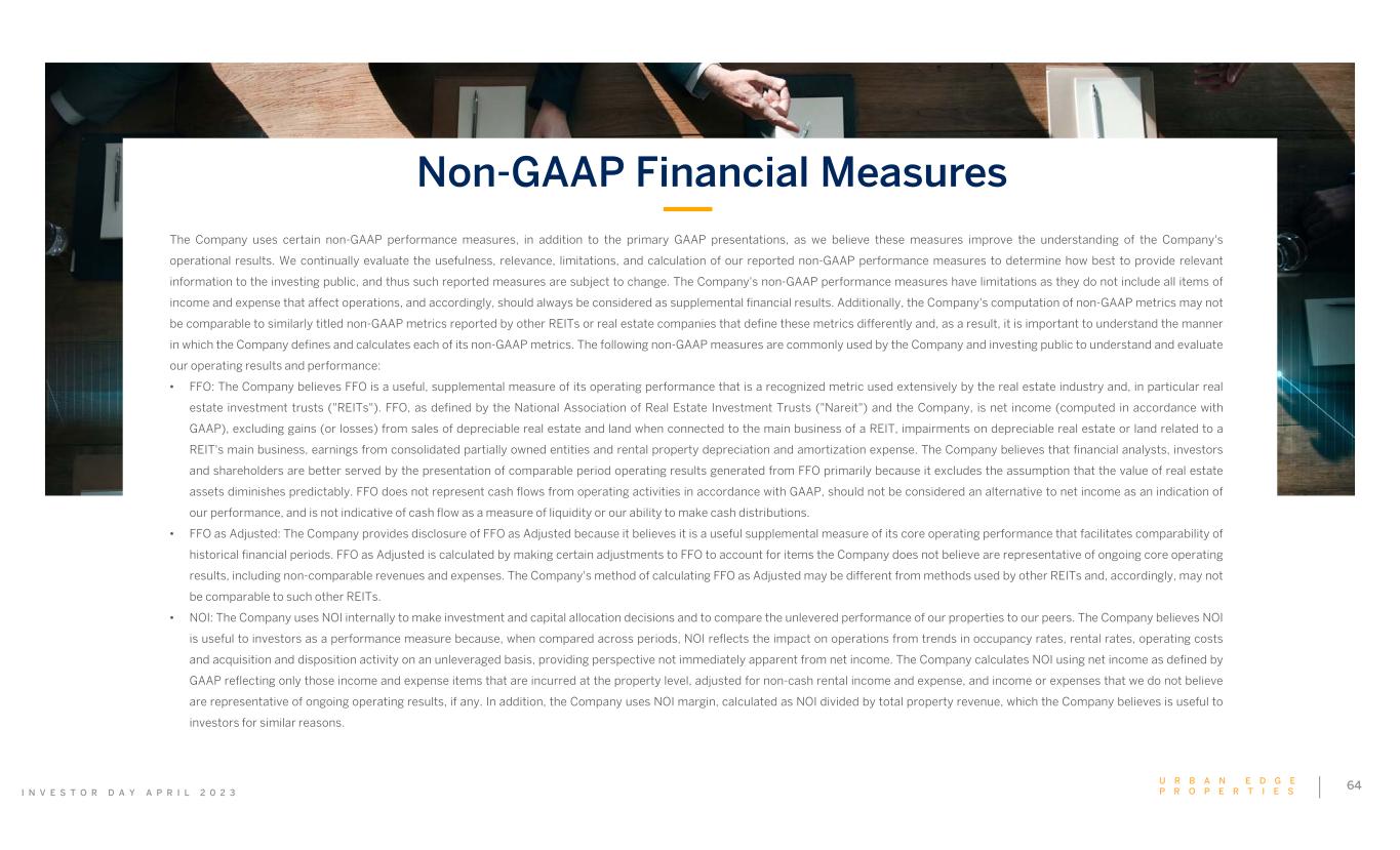 I N V E S T O R D A Y A P R I L 2 0 2 3 U R B A N E D G E P R O P E R T I E S 64 The Company uses certain non-GAAP performance measures, in addition to the primary GAAP presentations, as we believe these measures improve the understanding of the Company's operational results. We continually evaluate the usefulness, relevance, limitations, and calculation of our reported non-GAAP performance measures to determine how best to provide relevant information to the investing public, and thus such reported measures are subject to change. The Company's non-GAAP performance measures have limitations as they do not include all items of income and expense that affect operations, and accordingly, should always be considered as supplemental financial results. Additionally, the Company's computation of non-GAAP metrics may not be comparable to similarly titled non-GAAP metrics reported by other REITs or real estate companies that define these metrics differently and, as a result, it is important to understand the manner in which the Company defines and calculates each of its non-GAAP metrics. The following non-GAAP measures are commonly used by the Company and investing public to understand and evaluate our operating results and performance: • FFO: The Company believes FFO is a useful, supplemental measure of its operating performance that is a recognized metric used extensively by the real estate industry and, in particular real estate investment trusts ("REITs"). FFO, as defined by the National Association of Real Estate Investment Trusts ("Nareit") and the Company, is net income (computed in accordance with GAAP), excluding gains (or losses) from sales of depreciable real estate and land when connected to the main business of a REIT, impairments on depreciable real estate or land related to a REIT's main business, earnings from consolidated partially owned entities and rental property depreciation and amortization expense. The Company believes that financial analysts, investors and shareholders are better served by the presentation of comparable period operating results generated from FFO primarily because it excludes the assumption that the value of real estate assets diminishes predictably. FFO does not represent cash flows from operating activities in accordance with GAAP, should not be considered an alternative to net income as an indication of our performance, and is not indicative of cash flow as a measure of liquidity or our ability to make cash distributions. • FFO as Adjusted: The Company provides disclosure of FFO as Adjusted because it believes it is a useful supplemental measure of its core operating performance that facilitates comparability of historical financial periods. FFO as Adjusted is calculated by making certain adjustments to FFO to account for items the Company does not believe are representative of ongoing core operating results, including non-comparable revenues and expenses. The Company's method of calculating FFO as Adjusted may be different from methods used by other REITs and, accordingly, may not be comparable to such other REITs. • NOI: The Company uses NOI internally to make investment and capital allocation decisions and to compare the unlevered performance of our properties to our peers. The Company believes NOI is useful to investors as a performance measure because, when compared across periods, NOI reflects the impact on operations from trends in occupancy rates, rental rates, operating costs and acquisition and disposition activity on an unleveraged basis, providing perspective not immediately apparent from net income. The Company calculates NOI using net income as defined by GAAP reflecting only those income and expense items that are incurred at the property level, adjusted for non-cash rental income and expense, and income or expenses that we do not believe are representative of ongoing operating results, if any. In addition, the Company uses NOI margin, calculated as NOI divided by total property revenue, which the Company believes is useful to investors for similar reasons. Non-GAAP Financial Measures