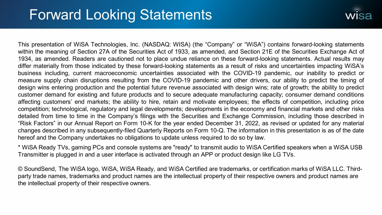 Forward Looking Statements This presentation of WiSA Technologies, Inc . (NASDAQ : WISA) (the “Company” or “ WiSA ”) contains forward - looking statements within the meaning of Section 27 A of the Securities Act of 1933 , as amended, and Section 21 E of the Securities Exchange Act of 1934 , as amended . Readers are cautioned not to place undue reliance on these forward - looking statements . Actual results may differ materially from those indicated by these forward - looking statements as a result of risks and uncertainties impacting WiSA’s business including, current macroeconomic uncertainties associated with the COVID - 19 pandemic, our inability to predict or measure supply chain disruptions resulting from the COVID - 19 pandemic and other drivers, our ability to predict the timing of design wins entering production and the potential future revenue associated with design wins ; rate of growth ; the ability to predict customer demand for existing and future products and to secure adequate manufacturing capacity ; consumer demand conditions affecting customers’ end markets ; the ability to hire, retain and motivate employees ; the effects of competition, including price competition ; technological, regulatory and legal developments ; developments in the economy and financial markets and other risks detailed from time to time in the Company’s filings with the Securities and Exchange Commission, including those described in “Risk Factors” in our Annual Report on Form 10 - K for the year ended December 31 , 2022 , as revised or updated for any material changes described in any subsequently - filed Quarterly Reports on Form 10 - Q . The information in this presentation is as of the date hereof and the Company undertakes no obligations to update unless required to do so by law . * WiSA Ready TVs, gaming PCs and console systems are "ready" to transmit audio to WiSA Certified speakers when a WiSA USB Transmitter is plugged in and a user interface is activated through an APP or product design like LG TVs. © SoundSend , The WiSA logo, WiSA , WiSA Ready, and WiSA Certified are trademarks, or certification marks of WiSA LLC. Third - party trade names, trademarks and product names are the intellectual property of their respective owners and product names ar e the intellectual property of their respective owners.