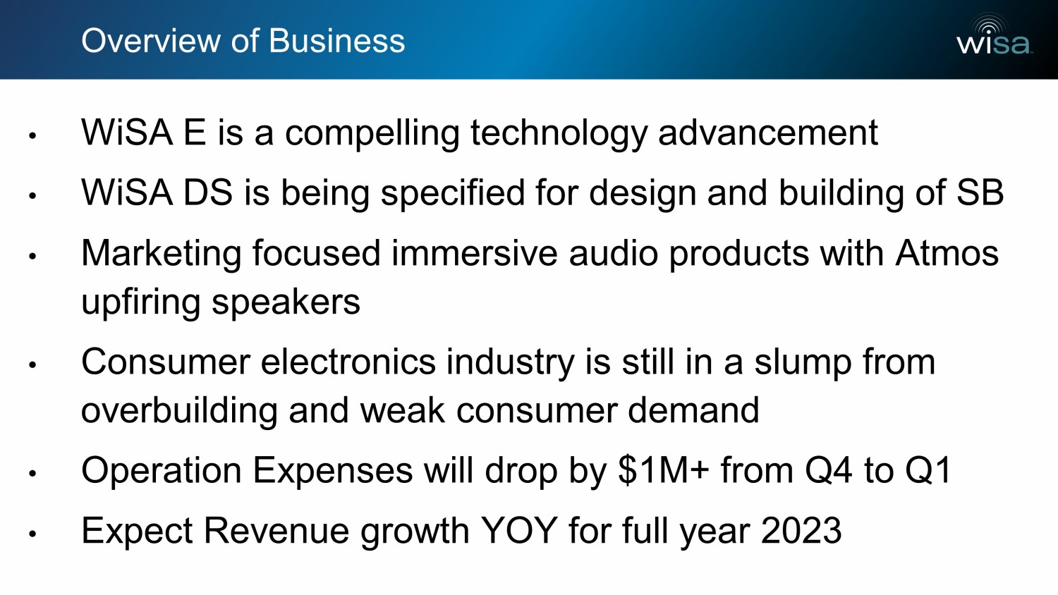 Overview of Business • WiSA E is a compelling technology advancement • WiSA DS is being specified for design and building of SB • Marketing focused immersive audio products with Atmos upfiring speakers • Consumer electronics industry is still in a slump from overbuilding and weak consumer demand • Operation Expenses will drop by $1M+ from Q4 to Q1 • Expect Revenue growth YOY for full year 2023