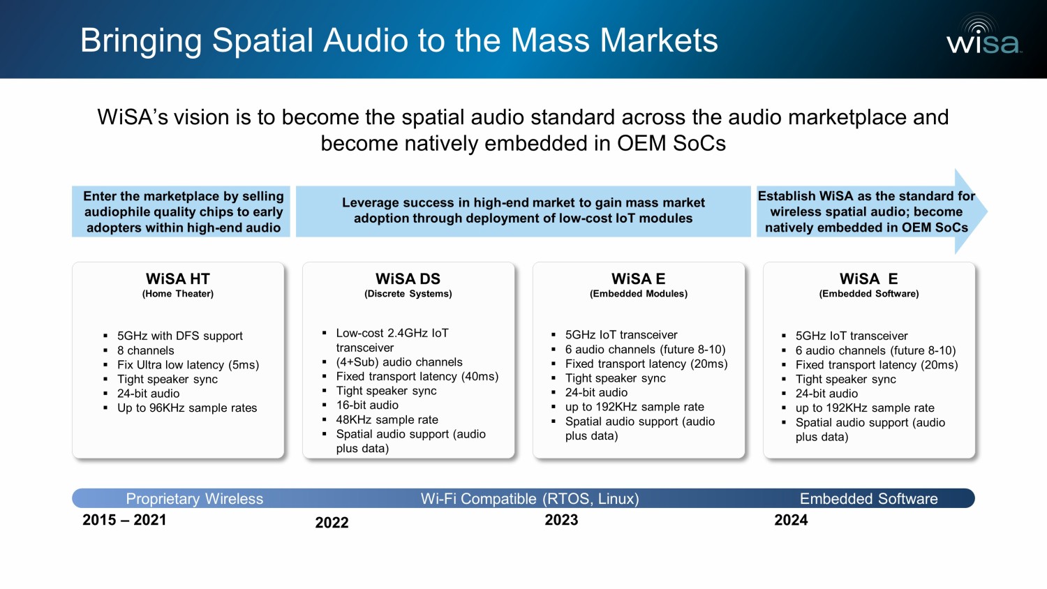 Bringing Spatial Audio to the Mass Markets 2015 – 2021 2022 2023 2024 Proprietary Wireless Wi - Fi Compatible (RTOS, Linux) WiSA HT (Home Theater) WiSA DS (Discrete Systems) WiSA E (Embedded Modules) WiSA E (Embedded Software) Enter the marketplace by selling audiophile quality chips to early adopters within high - end audio Leverage success in high - end market to gain mass market adoption through deployment of low - cost IoT modules Establish WiSA as the standard for wireless spatial audio; become natively embedded in OEM SoCs ▪ 5GHz with DFS support ▪ 8 channels ▪ Fix Ultra low latency (5ms) ▪ Tight speaker sync ▪ 24 - bit audio ▪ Up to 96KHz sample rates ▪ Low - cost 2.4GHz IoT transceiver ▪ (4+Sub) audio channels ▪ Fixed transport latency (40ms) ▪ Tight speaker sync ▪ 16 - bit audio ▪ 48KHz sample rate ▪ Spatial audio support (audio plus data) ▪ 5GHz IoT transceiver ▪ 6 audio channels (future 8 - 10) ▪ Fixed transport latency (20ms) ▪ Tight speaker sync ▪ 24 - bit audio ▪ up to 192KHz sample rate ▪ Spatial audio support (audio plus data) ▪ 5GHz IoT transceiver ▪ 6 audio channels (future 8 - 10) ▪ Fixed transport latency (20ms) ▪ Tight speaker sync ▪ 24 - bit audio ▪ up to 192KHz sample rate ▪ Spatial audio support (audio plus data) WiSA’s vision is to become the spatial audio standard across the audio marketplace and become natively embedded in OEM SoCs Embedded Software