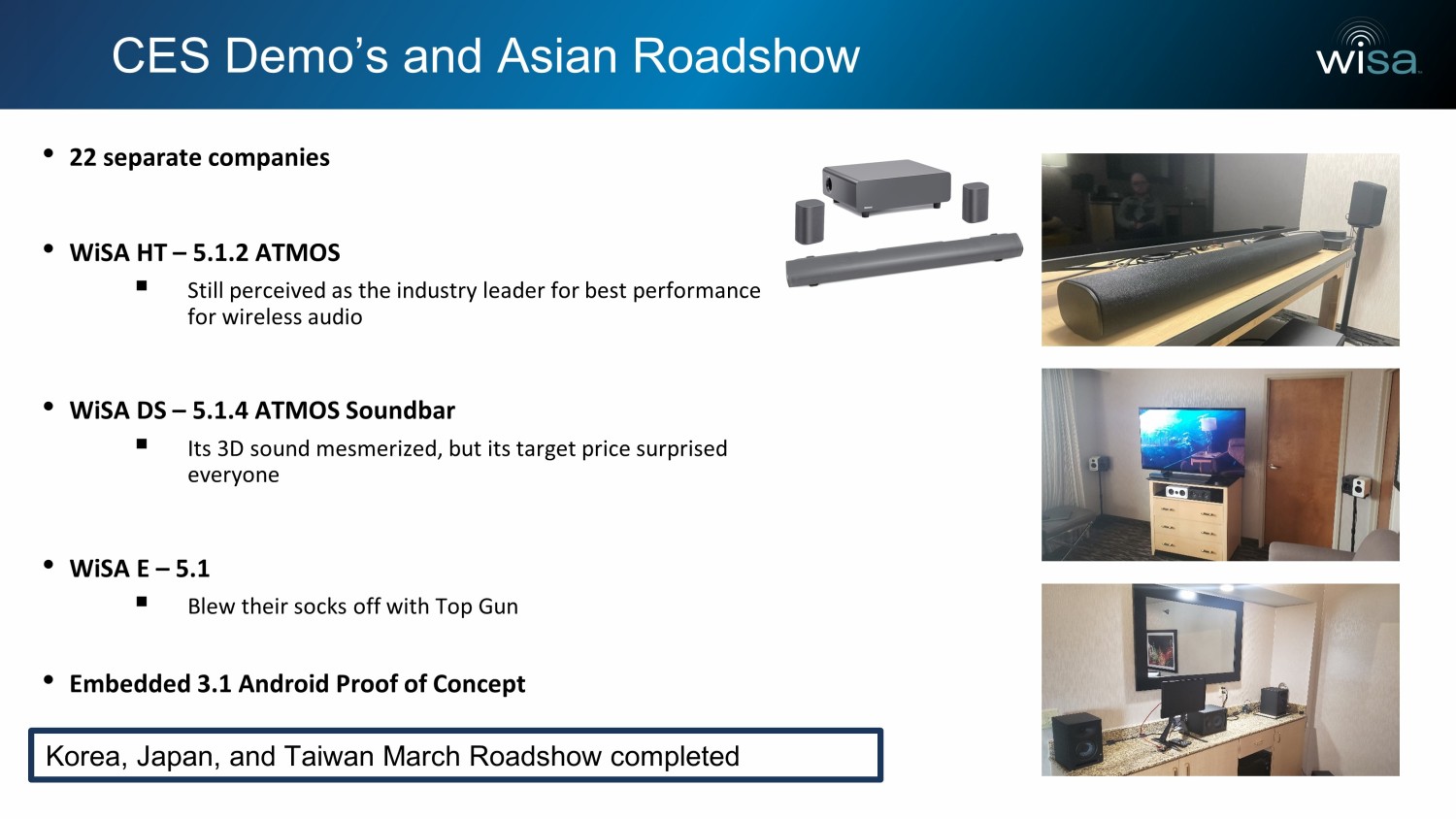 CES Demo’s and Asian Roadshow • 22 separate companies • WiSA HT – 5.1.2 ATMOS ▪ Still perceived as the industry leader for best performance for wireless audio • WiSA DS – 5.1.4 ATMOS Soundbar ▪ Its 3D sound mesmerized, but its target price surprised everyone • WiSA E – 5.1 ▪ Blew their socks off with Top Gun • Embedded 3.1 Android Proof of Concept Korea, Japan, and Taiwan March Roadshow completed