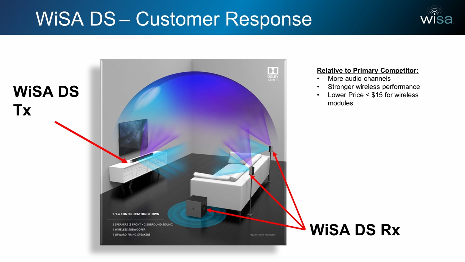 WiSA DS – Customer Response WiSA DS Rx WiSA DS Tx Relative to Primary Competitor: • More audio channels • Stronger wireless performance • Lower Price < $15 for wireless modules