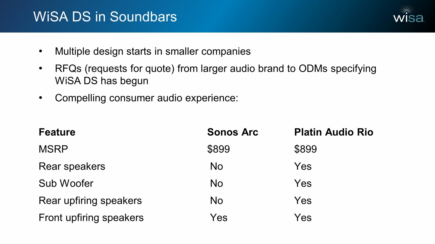 WiSA DS in Soundbars • Multiple design starts in smaller companies • RFQs (requests for quote) from larger audio brand to ODMs specifying WiSA DS has begun • Compelling consumer audio experience: Feature Sonos Arc Platin Audio Rio MSRP $899 $899 Rear speakers No Yes Sub Woofer No Yes Rear upfiring speakers No Yes Front upfiring speakers Yes Yes