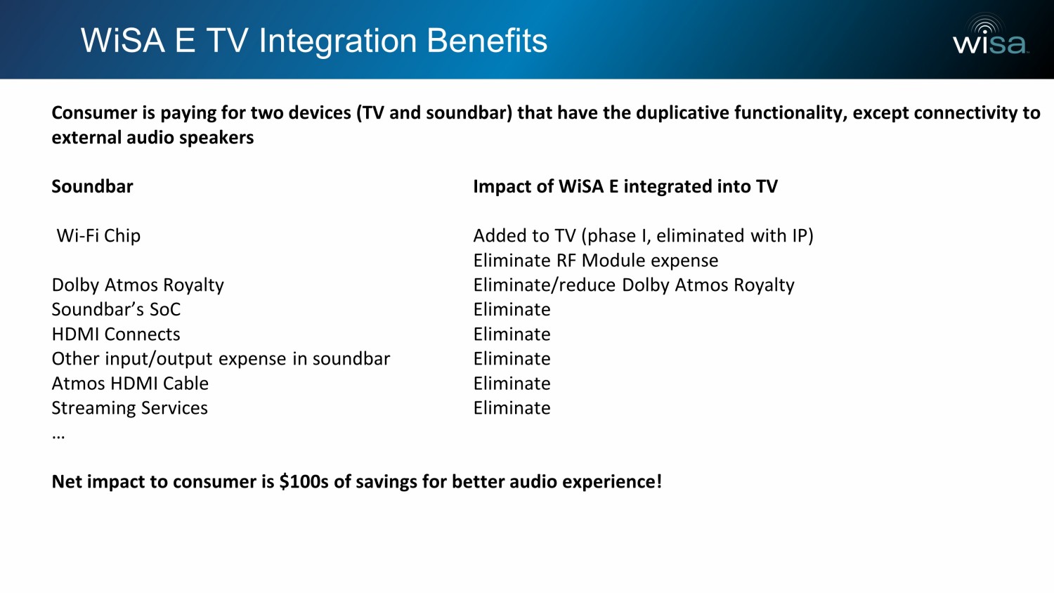 WiSA E TV Integration Benefits Consumer is paying for two devices (TV and soundbar) that have the duplicative functionality, except connectivity to external audio speakers Soundbar Impact of WiSA E integrated into TV Wi - Fi Chip Added to TV (phase I, eliminated with IP) Eliminate RF Module expense Dolby Atmos Royalty Eliminate/reduce Dolby Atmos Royalty Soundbar’s SoC Eliminate HDMI Connects Eliminate Other input/output expense in soundbar Eliminate Atmos HDMI Cable Eliminate Streaming Services Eliminate … Net impact to consumer is $100s of savings for better audio experience!