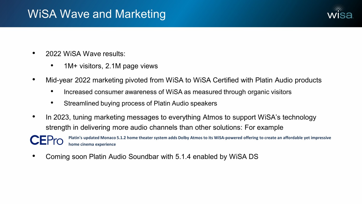WiSA Wave and Marketing • 2022 WiSA Wave results: • 1M+ visitors, 2.1M page views • Mid - year 2022 marketing pivoted from WiSA to WiSA Certified with Platin Audio products • Increased consumer awareness of WiSA as measured through organic visitors • Streamlined buying process of Platin Audio speakers • In 2023, tuning marketing messages to everything Atmos to support WiSA’s technology strength in delivering more audio channels than other solutions: For example Platin's updated Monaco 5.1.2 home theater system adds Dolby Atmos to its WiSA - powered offering to create an affordable yet impr essive home cinema experience • Coming soon Platin Audio Soundbar with 5.1.4 enabled by WiSA DS