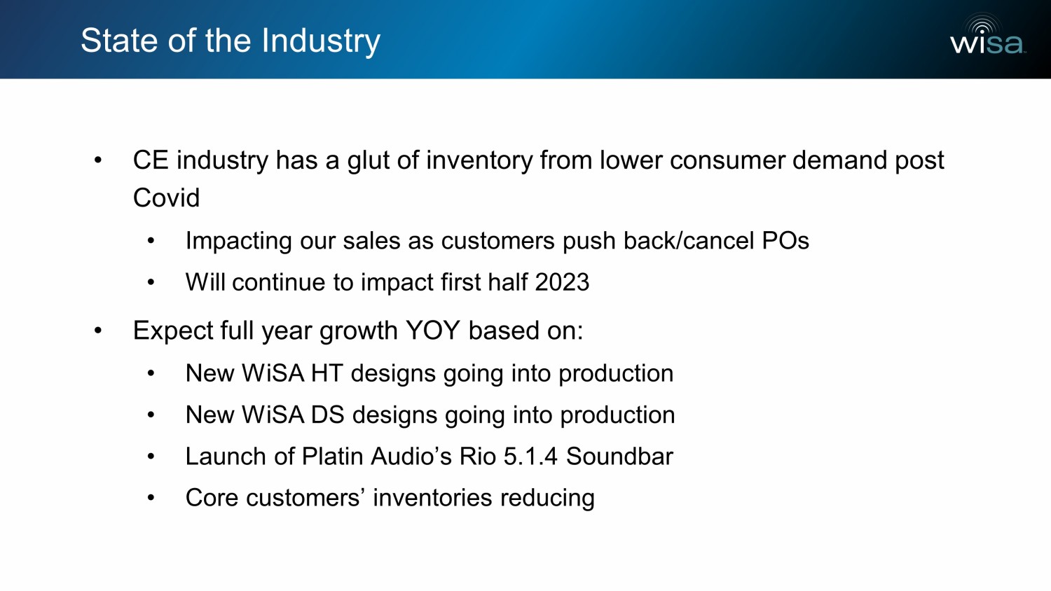 State of the Industry • CE industry has a glut of inventory from lower consumer demand post Covid • Impacting our sales as customers push back/cancel POs • Will continue to impact first half 2023 • Expect full year growth YOY based on: • New WiSA HT designs going into production • New WiSA DS designs going into production • Launch of Platin Audio’s Rio 5.1.4 Soundbar • Core customers’ inventories reducing
