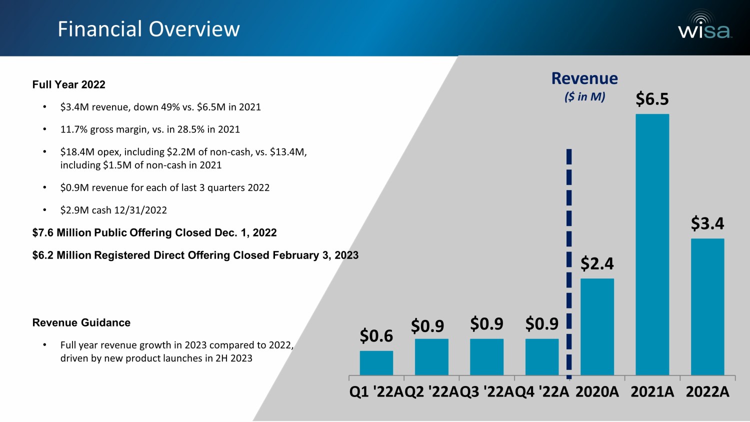 $0.6 $0.9 $0.9 $0.9 $2.4 $6.5 $3.4 Q1 '22A Q2 '22A Q3 '22A Q4 '22A 2020A 2021A 2022A Revenue ($ in M) Full Year 2022 • $3.4M revenue, down 49 % vs. $6.5M in 202 1 • 11.7 % gross margin, vs. in 28.5 % in 2021 • $18.4M opex , including $2.2M of non - cash, vs. $13.4M, including $1.5M of non - cash in 2021 • $0.9M revenue for each of last 3 quarters 2022 • $2.9M cash 12/31/2022 $7.6 Million Public Offering Closed Dec. 1, 2022 $6.2 Million Registered Direct Offering Closed February 3, 2023 Revenue Guidance • Full year revenue growth in 2023 compared to 2022, driven by new product launches in 2H 2023 Financial Overview