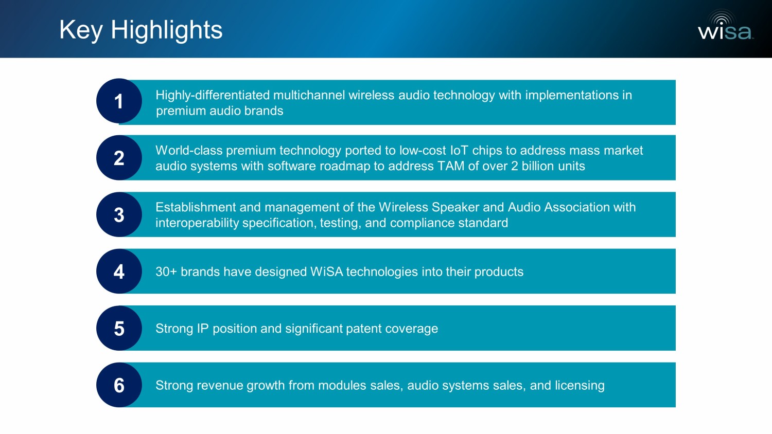 Key Highlights Highly - differentiated multichannel wireless audio technology with implementations in premium audio brands 1 World - class premium technology porte d to low - cost IoT chips to address mass market audio systems with software roadmap to address TAM of over 2 billion units 2 Establishment and management of the Wireless Speaker and Audio Association with interoperability specification, testing, and compliance standard 3 30+ brands have designed WiSA technologies into their products 4 Strong IP position and significant patent coverage 5 Strong revenue growth from modules sales, audio systems sales, and licensing 6