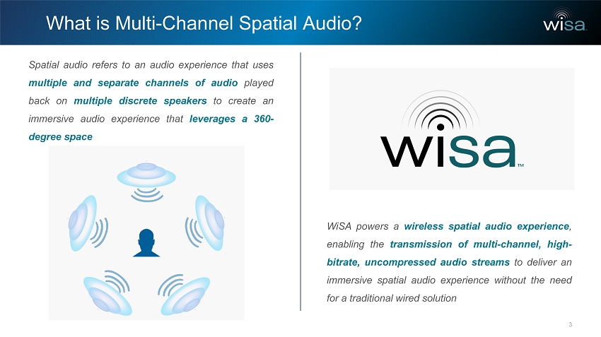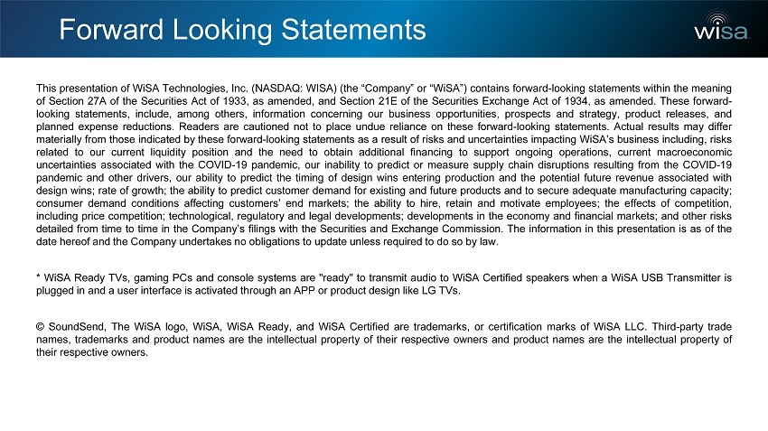 Forward Looking Statements This presentation of WiSA Technologies, Inc . (NASDAQ : WISA) (the “Company” or “ WiSA ”) contains forward - looking statements within the meaning of Section 27 A of the Securities Act of 1933 , as amended, and Section 21 E of the Securities Exchange Act of 1934 , as amended . These forward - looking statements, include, among others, information concerning our business opportunities, prospects and strategy, product releases, and planned expense reductions . Readers are cautioned not to place undue reliance on these forward - looking statements . Actual results may differ materially from those indicated by these forward - looking statements as a result of risks and uncertainties impacting WiSA’s business including, risks related to our current liquidity position and the need to obtain additional financing to support ongoing operations, current macroeconomic uncertainties associated with the COVID - 19 pandemic, our inability to predict or measure supply chain disruptions resulting from the COVID - 19 pandemic and other drivers, our ability to predict the timing of design wins entering production and the potential future revenue associated with design wins ; rate of growth ; the ability to predict customer demand for existing and future products and to secure adequate manufacturing capacity ; consumer demand conditions affecting customers’ end markets ; the ability to hire, retain and motivate employees ; the effects of competition, including price competition ; technological, regulatory and legal developments ; developments in the economy and financial markets ; and other risks detailed from time to time in the Company’s filings with the Securities and Exchange Commission . The information in this presentation is as of the date hereof and the Company undertakes no obligations to update unless required to do so by law . * WiSA Ready TVs, gaming PCs and console systems are "ready" to transmit audio to WiSA Certified speakers when a WiSA USB Transmitter is plugged in and a user interface is activated through an APP or product design like LG TVs . © SoundSend , The WiSA logo, WiSA , WiSA Ready, and WiSA Certified are trademarks, or certification marks of WiSA LLC . Third - party trade names, trademarks and product names are the intellectual property of their respective owners and product names are the intellectual property of their respective owners .