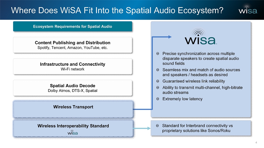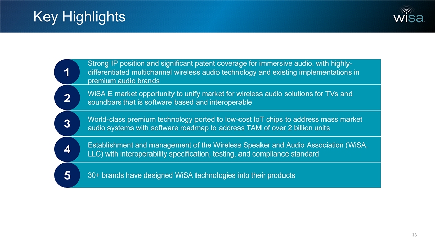 Key Highlights World - class premium technology porte d to low - cost IoT chips to address mass market audio systems with software roadmap to address TAM of over 2 billion units 3 Establishment and management of the Wireless Speaker and Audio Association ( WiSA , LLC) with interoperability specification, testing, and compliance standard 4 30+ brands have designed WiSA technologies into their products 5 WiSA E market opportunity to unify market for wireless audio solutions for TVs and soundbars that is software based and interoperable 2 Strong IP position and significant patent coverage for immersive audio, with highly - differentiated multichannel wireless audio technology and existing implementations in premium audio brands 1 13