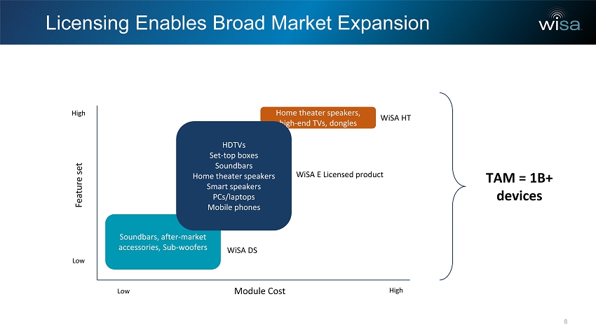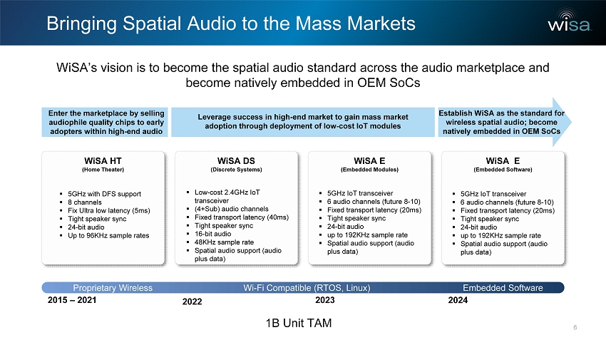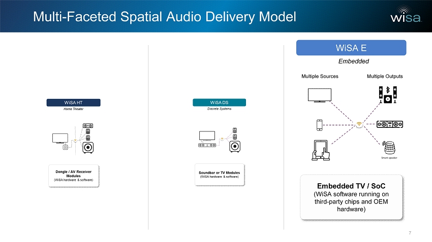 Bringing Spatial Audio to the Mass Markets 2015 – 2021 2022 2023 2024 Proprietary Wireless Wi - Fi Compatible (RTOS, Linux) WiSA HT (Home Theater) WiSA DS (Discrete Systems) WiSA E (Embedded Modules) WiSA E (Embedded Software) Enter the marketplace by selling audiophile quality chips to early adopters within high - end audio Leverage success in high - end market to gain mass market adoption through deployment of low - cost IoT modules Establish WiSA as the standard for wireless spatial audio; become natively embedded in OEM SoCs ▪ 5GHz with DFS support ▪ 8 channels ▪ Fix Ultra low latency (5ms) ▪ Tight speaker sync ▪ 24 - bit audio ▪ Up to 96KHz sample rates ▪ Low - cost 2.4GHz IoT transceiver ▪ (4+Sub) audio channels ▪ Fixed transport latency (40ms) ▪ Tight speaker sync ▪ 16 - bit audio ▪ 48KHz sample rate ▪ Spatial audio support (audio plus data) ▪ 5GHz IoT transceiver ▪ 6 audio channels (future 8 - 10) ▪ Fixed transport latency (20ms) ▪ Tight speaker sync ▪ 24 - bit audio ▪ up to 192KHz sample rate ▪ Spatial audio support (audio plus data) ▪ 5GHz IoT transceiver ▪ 6 audio channels (future 8 - 10) ▪ Fixed transport latency (20ms) ▪ Tight speaker sync ▪ 24 - bit audio ▪ up to 192KHz sample rate ▪ Spatial audio support (audio plus data) WiSA’s vision is to become the spatial audio standard across the audio marketplace and become natively embedded in OEM SoCs Embedded Software 1B Unit TAM 6