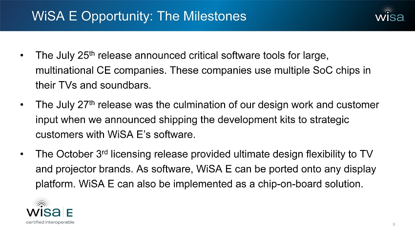 Licensing Enables Broad Market Expansion Module Cost Feature set Low High Low High Soundbars, after - market accessories, Sub - woofers Home theater speakers, high - end TVs, dongles WiSA HT WiSA E Licensed product WiSA DS HDTVs Set - top boxes Soundbars Home theater speakers Smart speakers PCs/laptops Mobile phones TAM = 1B+ devices 8
