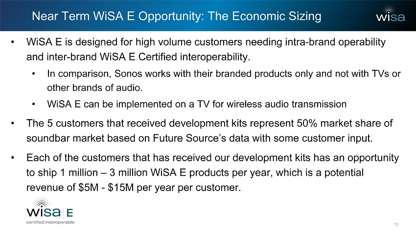 WiSA E Opportunity: The Milestones • The July 25 th release announced critical software tools for large, multinational CE companies. These companies use multiple SoC chips in their TVs and soundbars. • The July 27 th release was the culmination of our design work and customer input when we announced shipping the development kits to strategic customers with WiSA E’s software. • The October 3 rd licensing release provided ultimate design flexibility to TV and projector brands. As software, WiSA E can be ported onto any display platform. WiSA E can also be implemented as a chip - on - board solution. 9