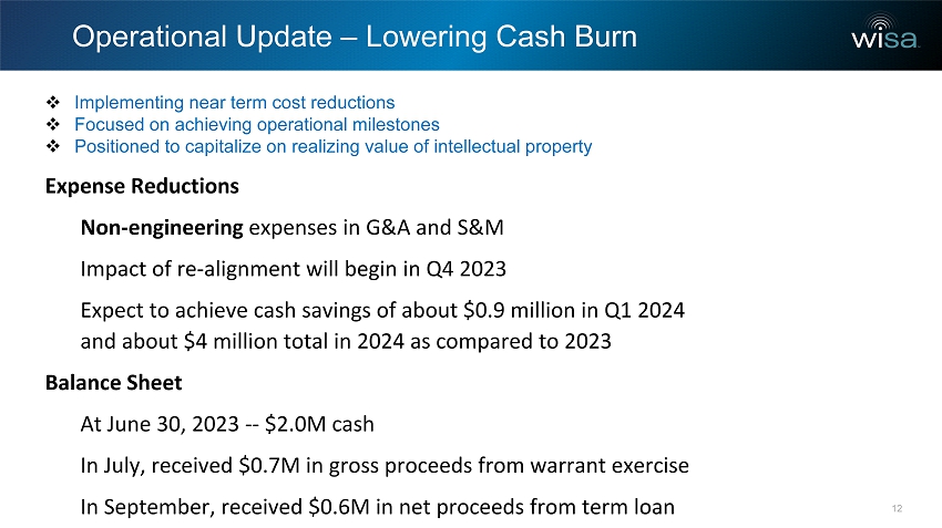 Expense Reductions • Non - engineering expenses in G&A and S&M • Impact of re - alignment will begin in Q4 2023 • Expect to achieve cash savings of about $0.9 million in Q1 2024 and about $4 million total in 2024 as compared to 2023 Balance Sheet • At June 30, 2023 -- $2.0M cash • In July, received $0.7M in gross proceeds from warrant exercise • In September, received $0.6M in net proceeds from term loan Operational Update – Lowering Cash Burn 12 □ Implementing near term cost reductions □ Focused on achieving operational milestones □ Positioned to capitalize on realizing value of intellectual property