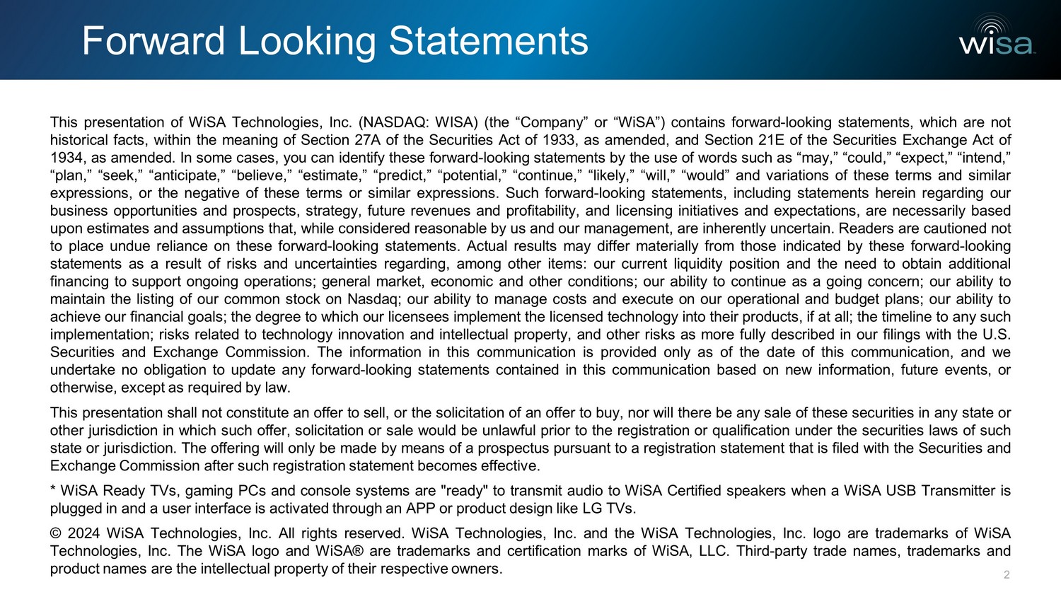 Forward Looking Statements This presentation of WiSA Technologies, Inc . (NASDAQ : WISA) (the “Company” or “WiSA”) contains forward - looking statements, which are not historical facts, within the meaning of Section 27 A of the Securities Act of 1933 , as amended, and Section 21 E of the Securities Exchange Act of 1934 , as amended . In some cases, you can identify these forward - looking statements by the use of words such as “may,” “could,” “expect,” “intend,” “plan,” “seek,” “anticipate,” “believe,” “estimate,” “predict,” “potential,” “continue,” “likely,” “will,” “would” and variations of these terms and similar expressions, or the negative of these terms or similar expressions . Such forward - looking statements, including statements herein regarding our business opportunities and prospects, strategy, future revenues and profitability, and licensing initiatives and expectations, are necessarily based upon estimates and assumptions that, while considered reasonable by us and our management, are inherently uncertain . Readers are cautioned not to place undue reliance on these forward - looking statements . Actual results may differ materially from those indicated by these forward - looking statements as a result of risks and uncertainties regarding, among other items : our current liquidity position and the need to obtain additional financing to support ongoing operations ; general market, economic and other conditions ; our ability to continue as a going concern ; our ability to maintain the listing of our common stock on Nasdaq ; our ability to manage costs and execute on our operational and budget plans ; our ability to achieve our financial goals ; the degree to which our licensees implement the licensed technology into their products, if at all ; the timeline to any such implementation ; risks related to technology innovation and intellectual property, and other risks as more fully described in our filings with the U . S . Securities and Exchange Commission . The information in this communication is provided only as of the date of this communication, and we undertake no obligation to update any forward - looking statements contained in this communication based on new information, future events, or otherwise, except as required by law . This presentation shall not constitute an offer to sell, or the solicitation of an offer to buy, nor will there be any sale of these securities in any state or other jurisdiction in which such offer, solicitation or sale would be unlawful prior to the registration or qualification under the securities laws of such state or jurisdiction . The offering will only be made by means of a prospectus pursuant to a registration statement that is filed with the Securities and Exchange Commission after such registration statement becomes effective . * WiSA Ready TVs, gaming PCs and console systems are "ready" to transmit audio to WiSA Certified speakers when a WiSA USB Transmitter is plugged in and a user interface is activated through an APP or product design like LG TVs . © 2024 WiSA Technologies, Inc . All rights reserved . WiSA Technologies, Inc . and the WiSA Technologies, Inc . logo are trademarks of WiSA Technologies, Inc . The WiSA logo and WiSA® are trademarks and certification marks of WiSA, LLC . Third - party trade names, trademarks and product names are the intellectual property of their respective owners . 2