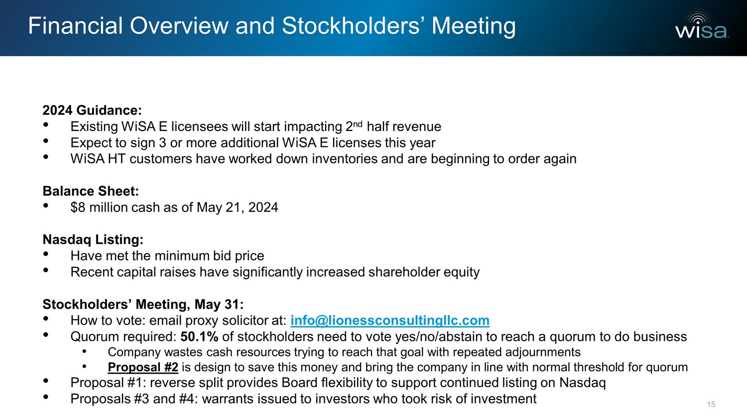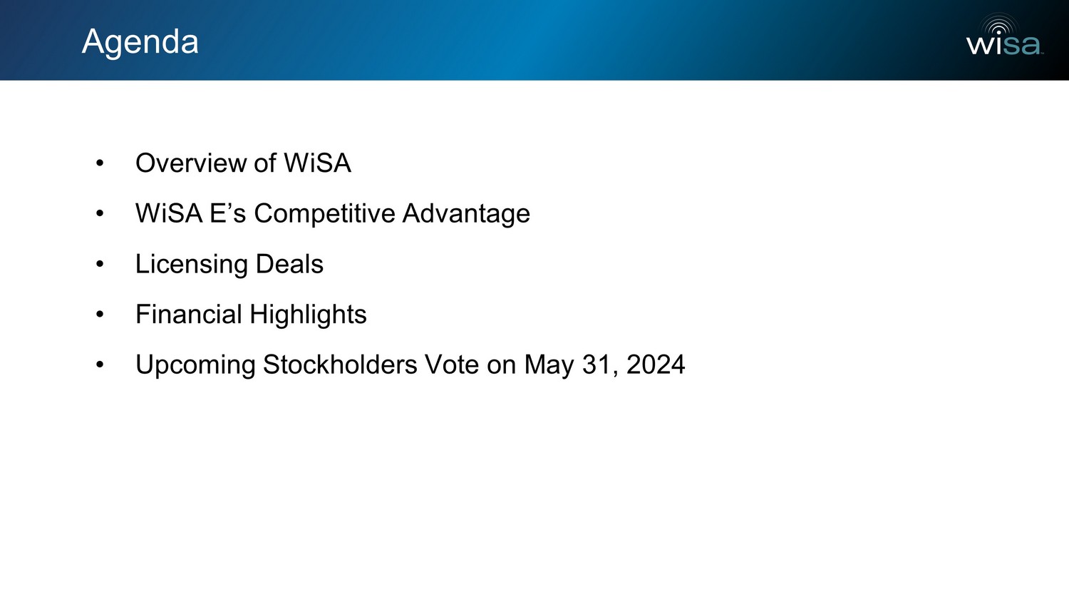 Agenda • Overview of WiSA • WiSA E’s Competitive Advantage • Licensing Deals • Financial Highlights • Upcoming Stockholders Vote on May 31, 2024