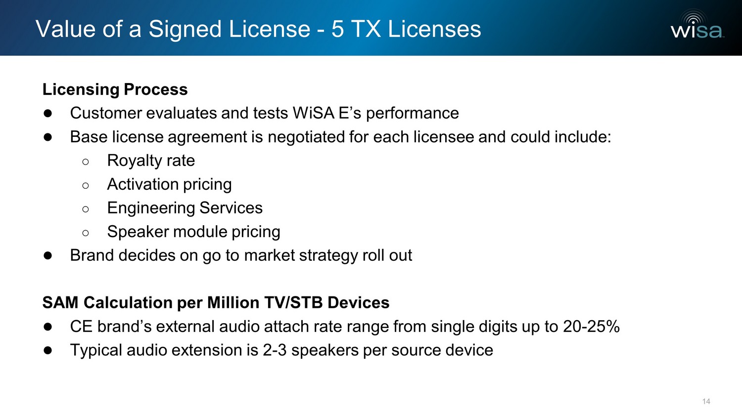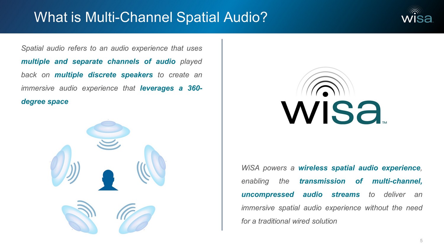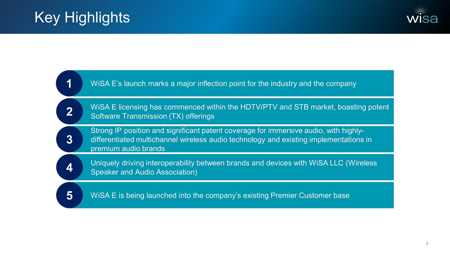 Key Highlights Strong IP position and significant patent coverage for immersive audio, with highly - differentiated multichannel wireless audio technology and existing implementations in premium audio brands 3 Uniquely driving interoperability between brands and devices with WiSA LLC (Wireless Speaker and Audio Association) 4 WiSA E is being launched into the company’s existing Premier Customer base 5 WiSA E licensing has commenced within the HDTV/PTV and STB market, boasting potent Software Transmission (TX) offerings 2 WiSA E’s launch marks a major inflection point for the industry and the company 1 4