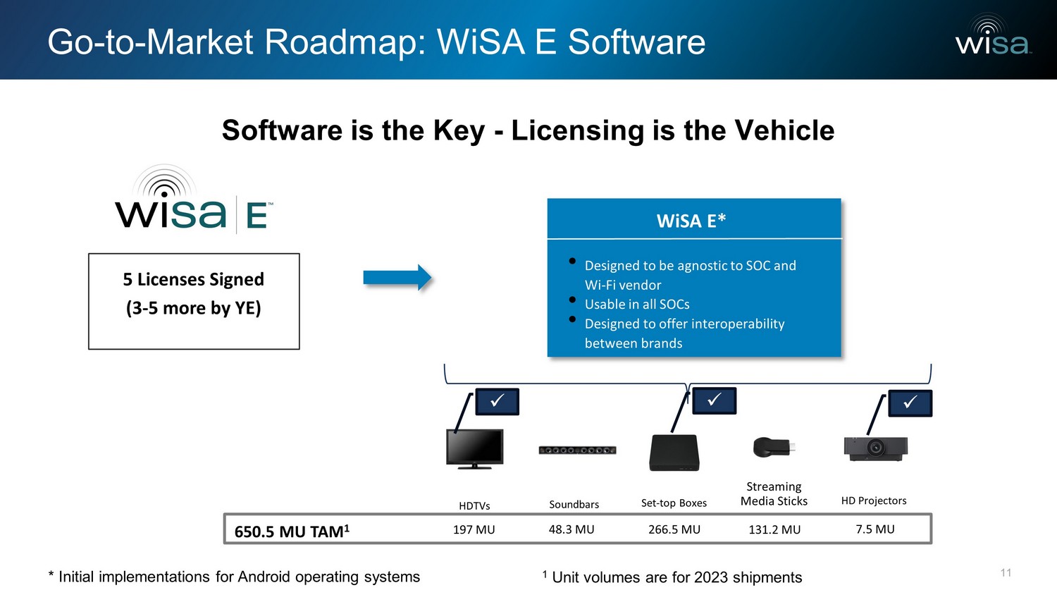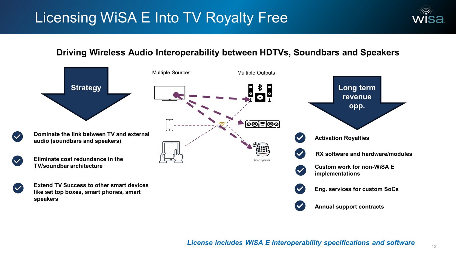 Go - to - Market Roadmap: WiSA E Software Software is the Key - Licensing is the Vehicle WiSA E* • Designed to be agnostic to SOC and Wi - Fi vendor • Usable in all SOCs • Designed to offer interoperability between brands 5 Licenses Signed (3 - 5 more by YE) 48.3 MU 266.5 MU 131.2 MU 7.5 MU HDTVs Soundbars Set - top Boxes Streaming Media Sticks HD Projectors 650.5 MU TAM 1 197 MU * Initial implementations for Android operating systems 1 Unit volumes are for 2023 shipments 11 x x x