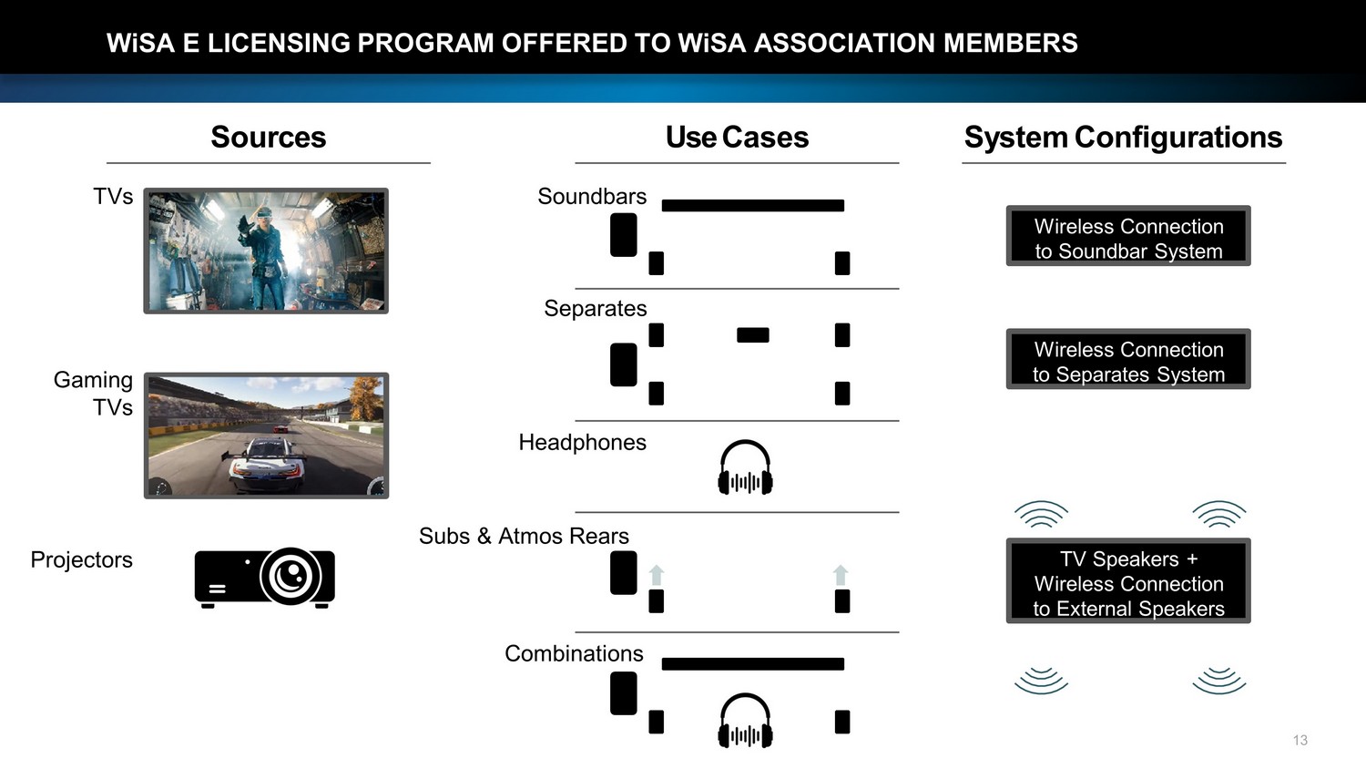 Sources WiSA E LICENSING PROGRAM OFFERED TO WiSA ASSOCIATION MEMBERS TVs Gaming TVs Use Cases System Configurations Soundbars Separates Headphones Subs & Atmos Rears TV Speakers + Wireless Connection to External Speakers Projectors Combinations Wireless Connection to Separates System Wireless Connection to Soundbar System 13