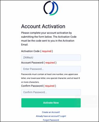 Copy and paste Activation Code or click Activate Account link. Create Password based on password requirements listed.