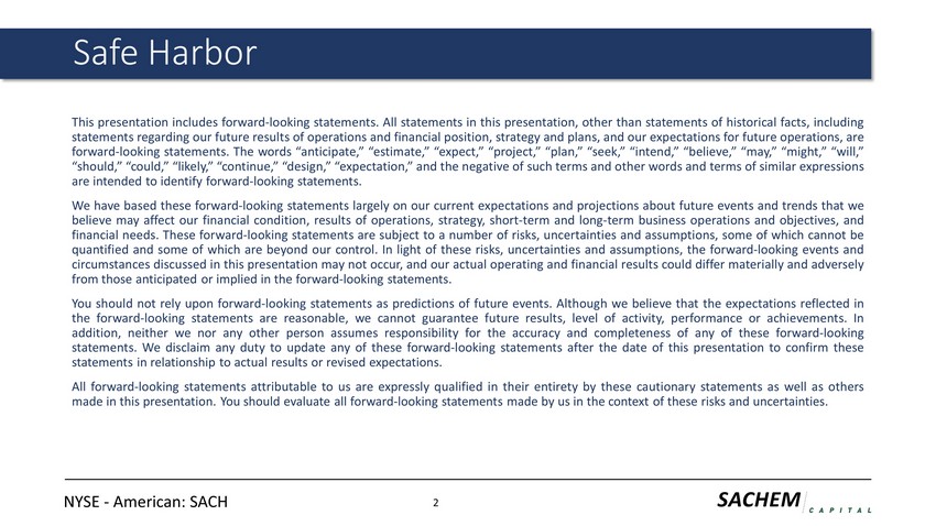 NYSE - American: SACH Safe Harbor This presentation includes forward - looking statements . All statements in this presentation, other than statements of historical facts, including statements regarding our future results of operations and financial position, strategy and plans, and our expectations for future operations, are forward - looking statements . The words “anticipate,” “estimate,” “expect,” “project,” “plan,” “seek,” “intend,” “believe,” “may,” “might,” “will,” “should,” “could,” “likely,” “continue,” “design,” “expectation,” and the negative of such terms and other words and terms of similar expressions are intended to identify forward - looking statements . We have based these forward - looking statements largely on our current expectations and projections about future events and trends that we believe may affect our financial condition, results of operations, strategy, short - term and long - term business operations and objectives, and financial needs . These forward - looking statements are subject to a number of risks, uncertainties and assumptions, some of which cannot be quantified and some of which are beyond our control . In light of these risks, uncertainties and assumptions, the forward - looking events and circumstances discussed in this presentation may not occur, and our actual operating and financial results could differ materially and adversely from those anticipated or implied in the forward - looking statements . You should not rely upon forward - looking statements as predictions of future events . Although we believe that the expectations reflected in the forward - looking statements are reasonable, we cannot guarantee future results, level of activity, performance or achievements . In addition, neither we nor any other person assumes responsibility for the accuracy and completeness of any of these forward - looking statements . We disclaim any duty to update any of these forward - looking statements after the date of this presentation to confirm these statements in relationship to actual results or revised expectations . All forward - looking statements attributable to us are expressly qualified in their entirety by these cautionary statements as well as others made in this presentation . You should evaluate all forward - looking statements made by us in the context of these risks and uncertainties . 2