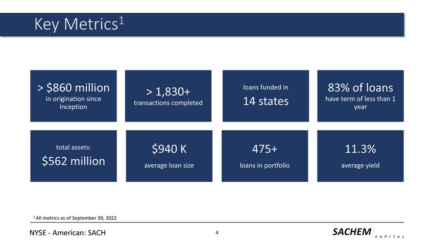 NYSE - American: SACH Investment Highlights ▪ $448.5 Million portfolio as of September 30, 2022 ▪ No loan represents more than 10% of portfolio ▪ Target LTV (loan - to - value) of 70%; Target LTC (loan - to - cost) of 85% 3 Strong Diversified Portfolio with Excellent Credit Metrics Multi - pronged Growth Strategy Proven Management Team Strong Capital Structure to Support Growth Strategy Compelling Valuation ▪ Dividend yield: 15.6%* ▪ Core EPS Multiple: 6.4x 2022 Consensus Core EPS* ▪ Debt of approximately $327.0 million 3Q 2022 ▪ $200 million master repurchase financing, approximately $150 million of available capacity remaining at 9/30/2022 ▪ Multiple asset classes to maximize opportunities ▪ Targeting larger - value projects with financially stable, experienced sponsors ▪ Expanding geographic footprint to include Florida, the Carolinas, and other states ▪ Over 90 years collectively of lending and asset management experience ▪ Disciplined underwriting with a conservative loan - to - value ratio ▪ Track record of growth *as of closing price of $3.33 on Sept 30, 2022