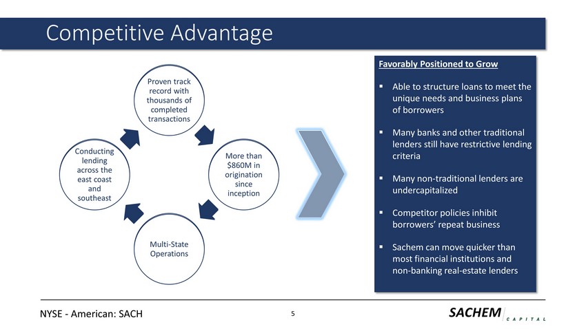 NYSE - American: SACH Key Metrics 1 > $860 million in origination since inception > 1,830+ transactions completed loans funded in 14 states 83% of loans have term of less than 1 year total assets: $562 million $940 K average loan size 475+ loans in portfolio 11.3% average yield 4 1 All metrics as of September 30, 2022